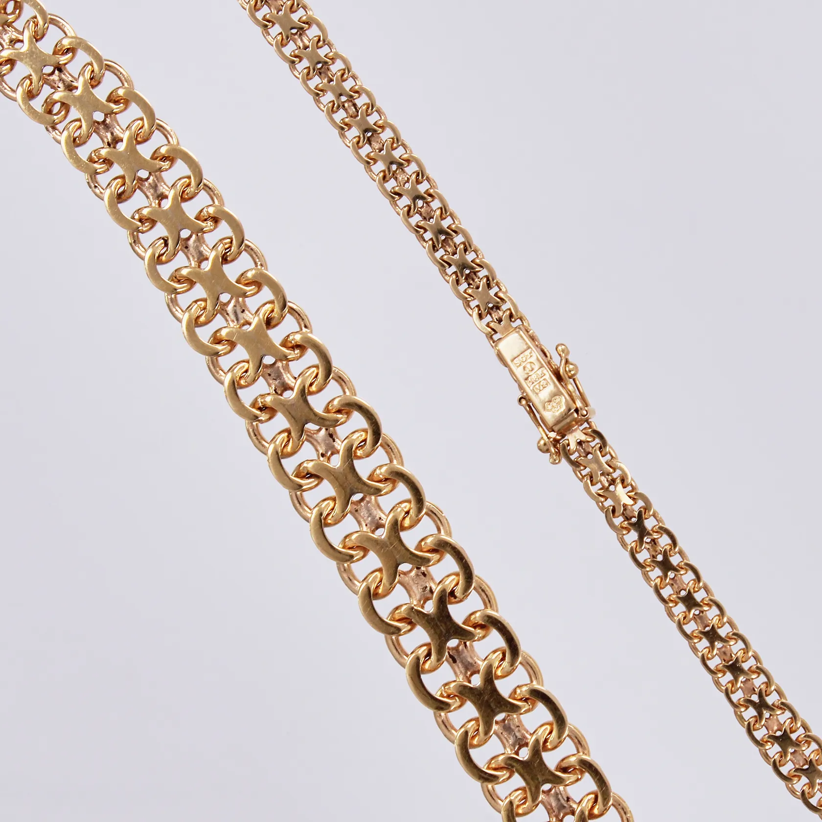 Collier, doserad X-länk, längd: ca 43cm, bredd: ca 4-12mm, SGT, Svenska Guldvaruaktiebolaget T Be, Stockholm, år 1961, 18K Vikt: 37,4 g.