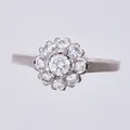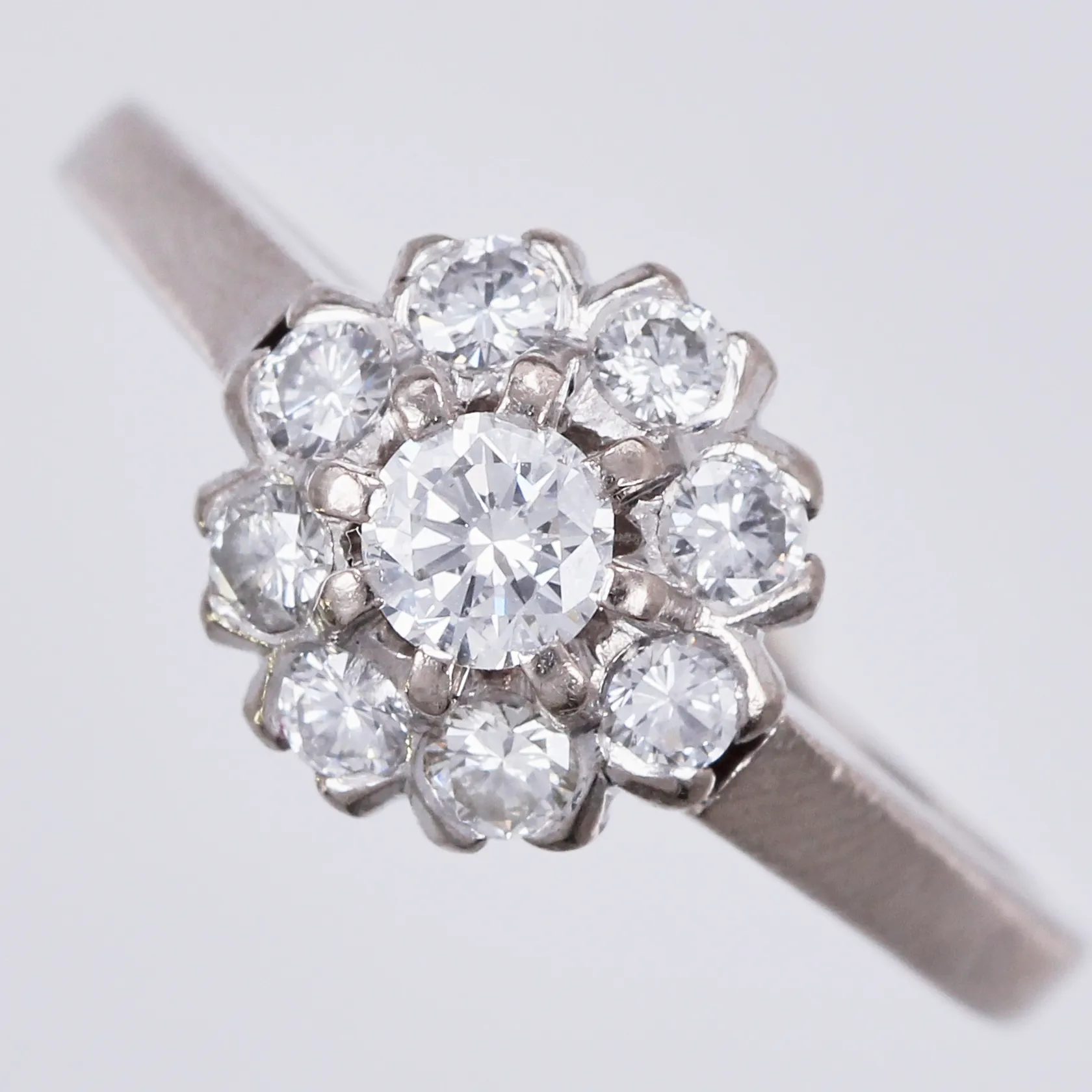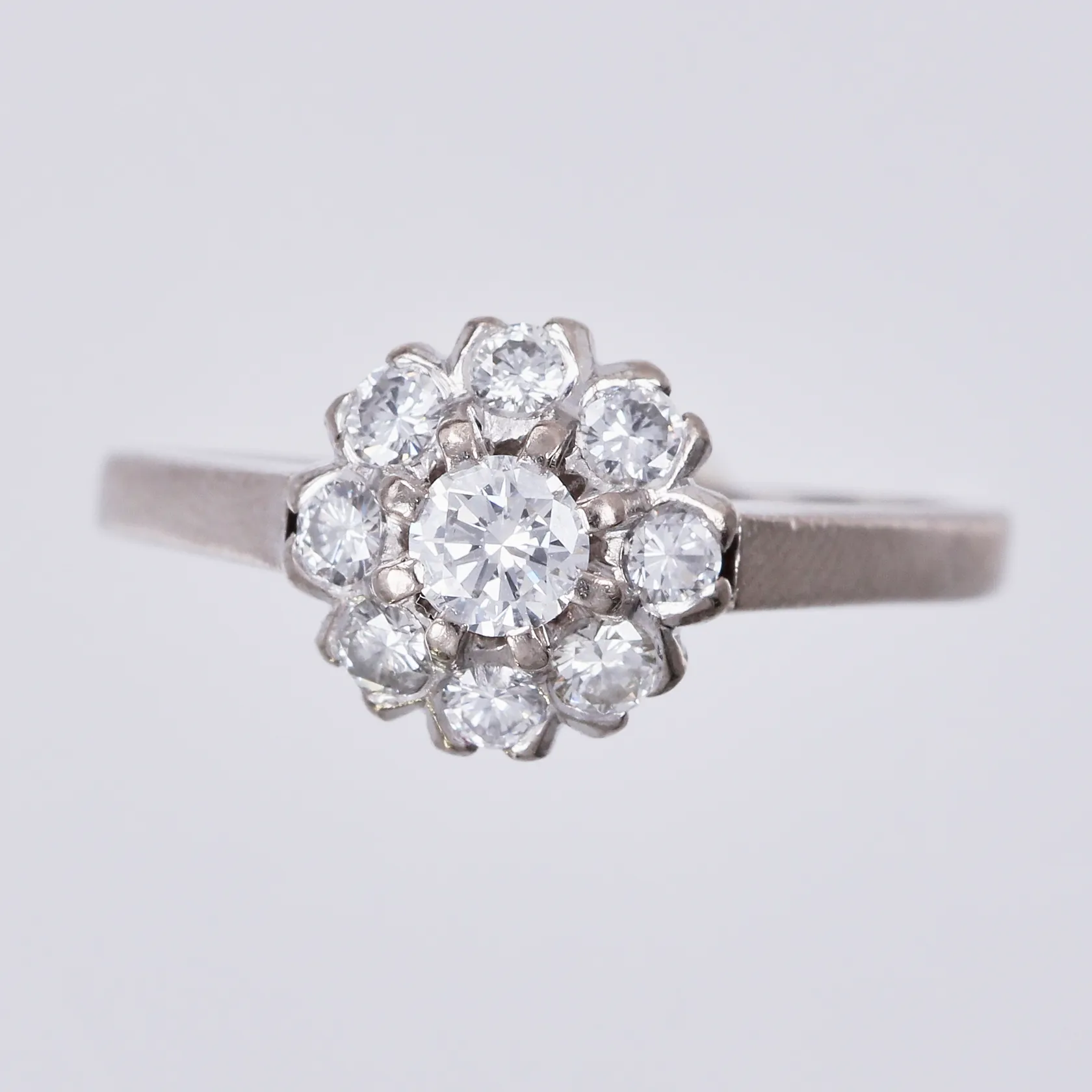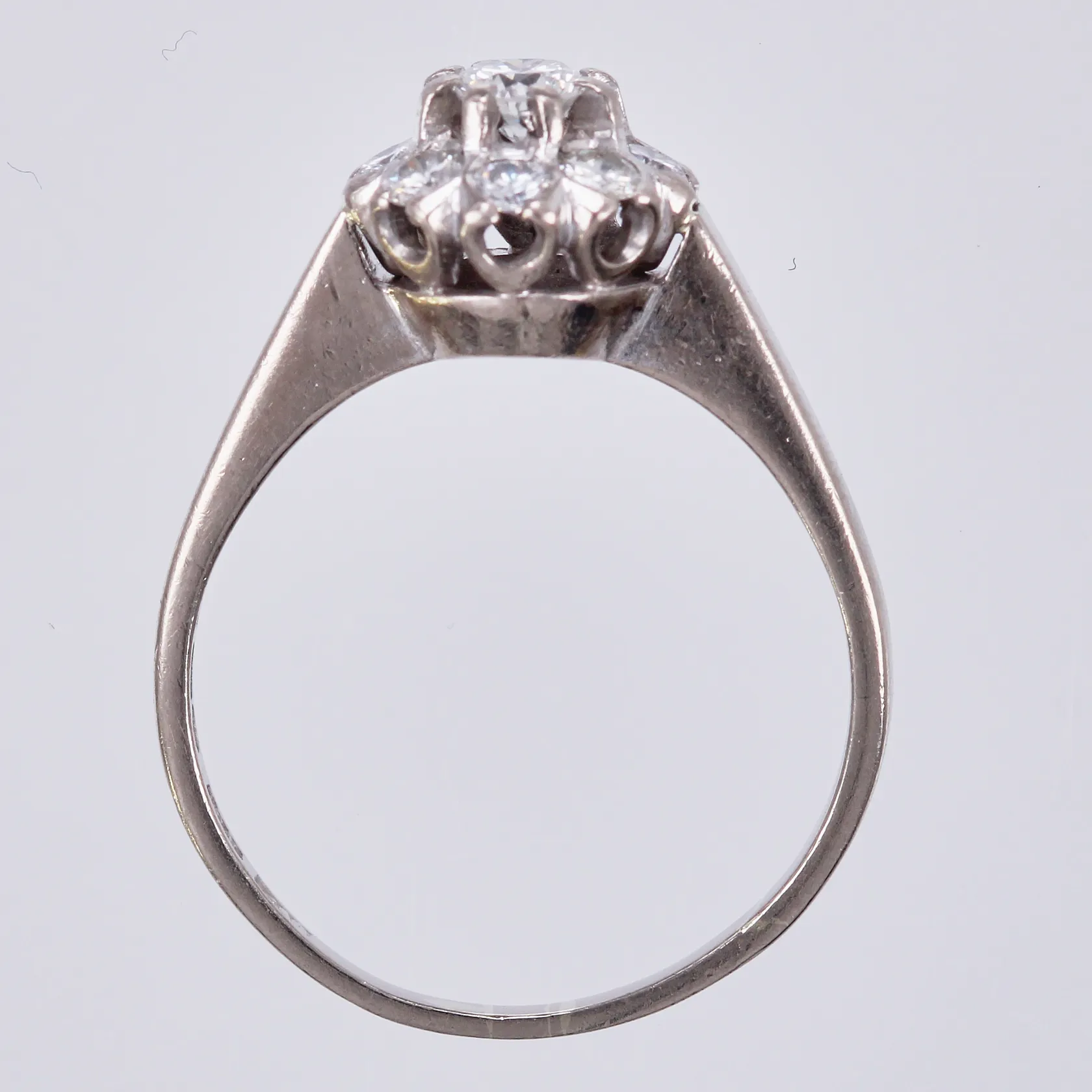 Ring med 9 diamanter totalt ca 0,57ct enl gravyr, 1xca 0,22ct W(H)/VS, 8xca 0,043ct, stl: ca 18, bredd: ca 1,5-10mm, K&EC, Ceson Guldvaru Ab, Göteborg, år 1980, vitguld, 18K Vikt: 4,1 g.
