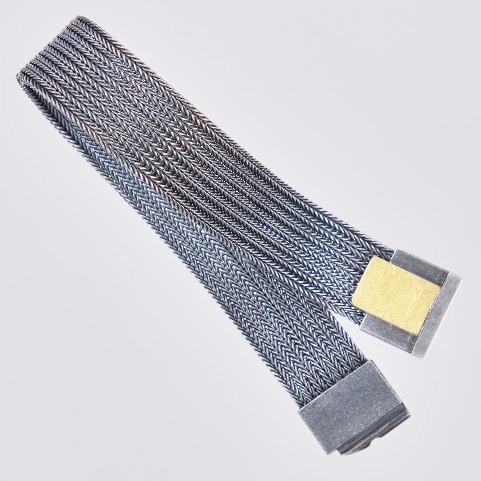 Armband i oxiderat silver, med förgyllda detaljer, längd ca 18,8cm, bredd ca 14mm, 925/1000 silver Vikt: 33,6 g.