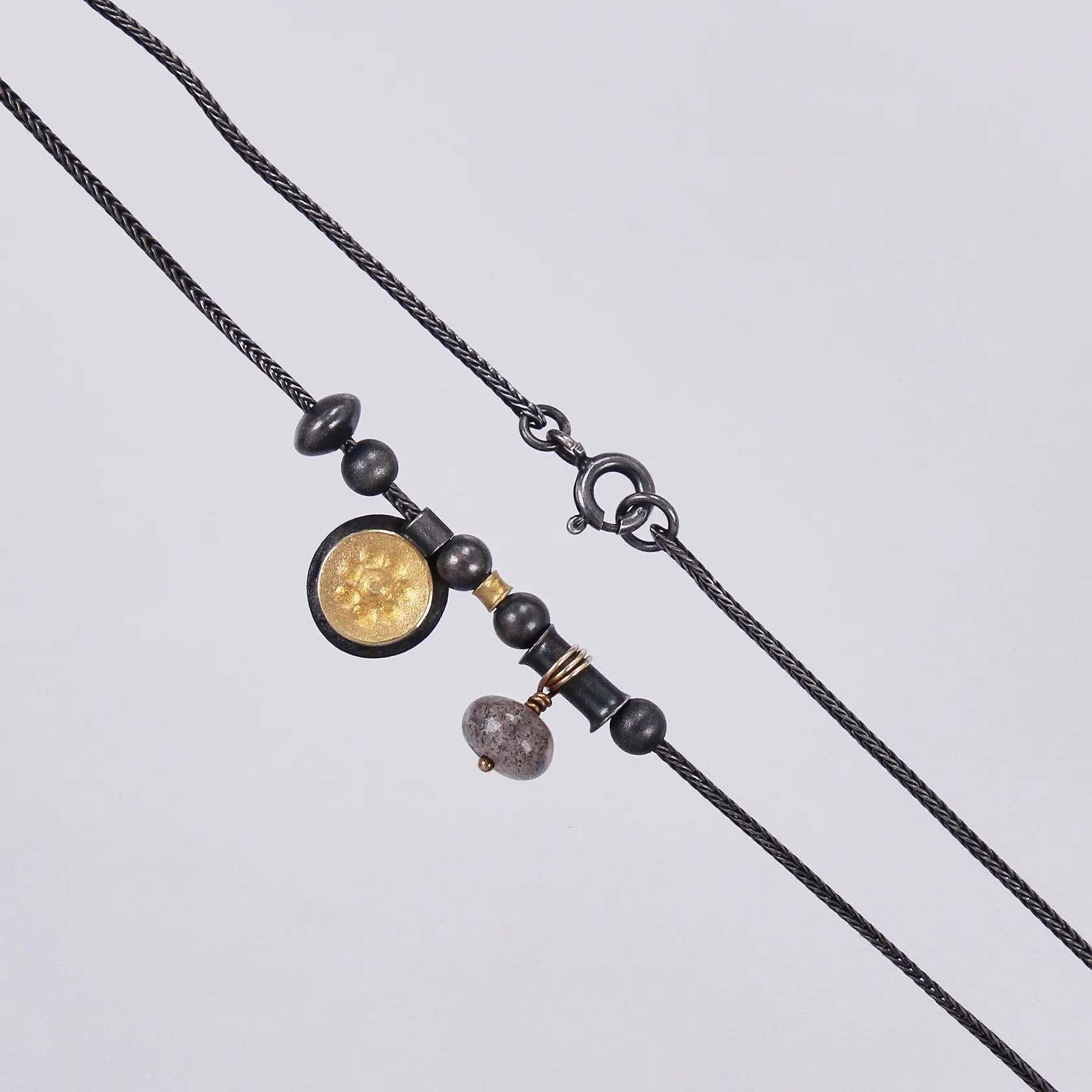 Collier i oxiderat silver & förgyllda detaljer, samt sten, längd ca 41,5cm, bredd ca 1-10mm, 925/1000 silver Vikt: 4,8 g.