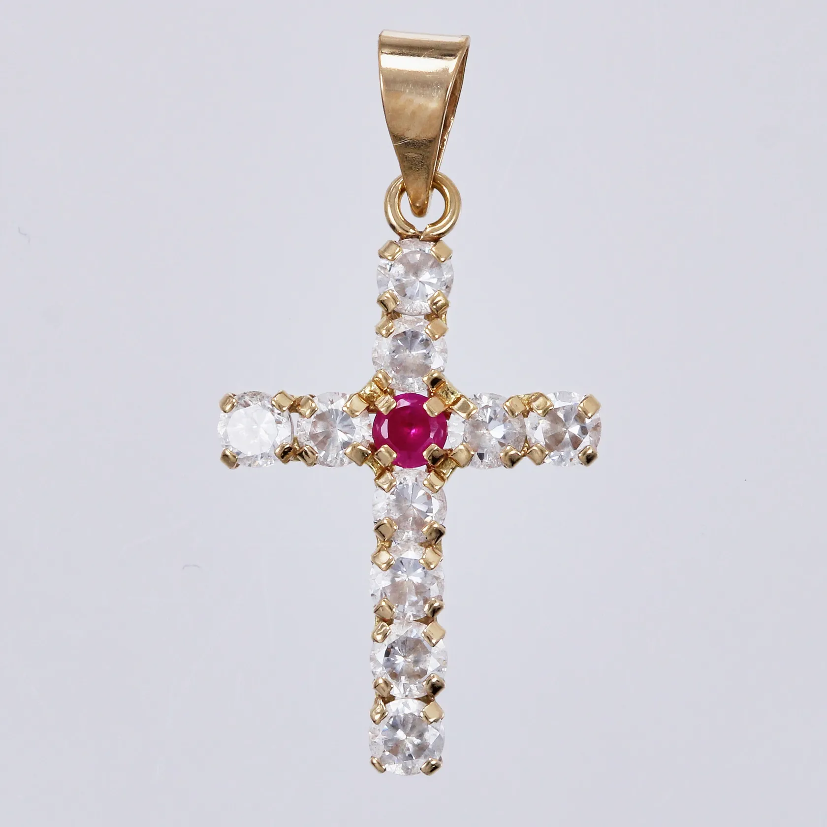 Hänge kors med röd & vita stenar, längd ca 22mm, bredd ca 12mm, 18K Vikt: 0,7 g.