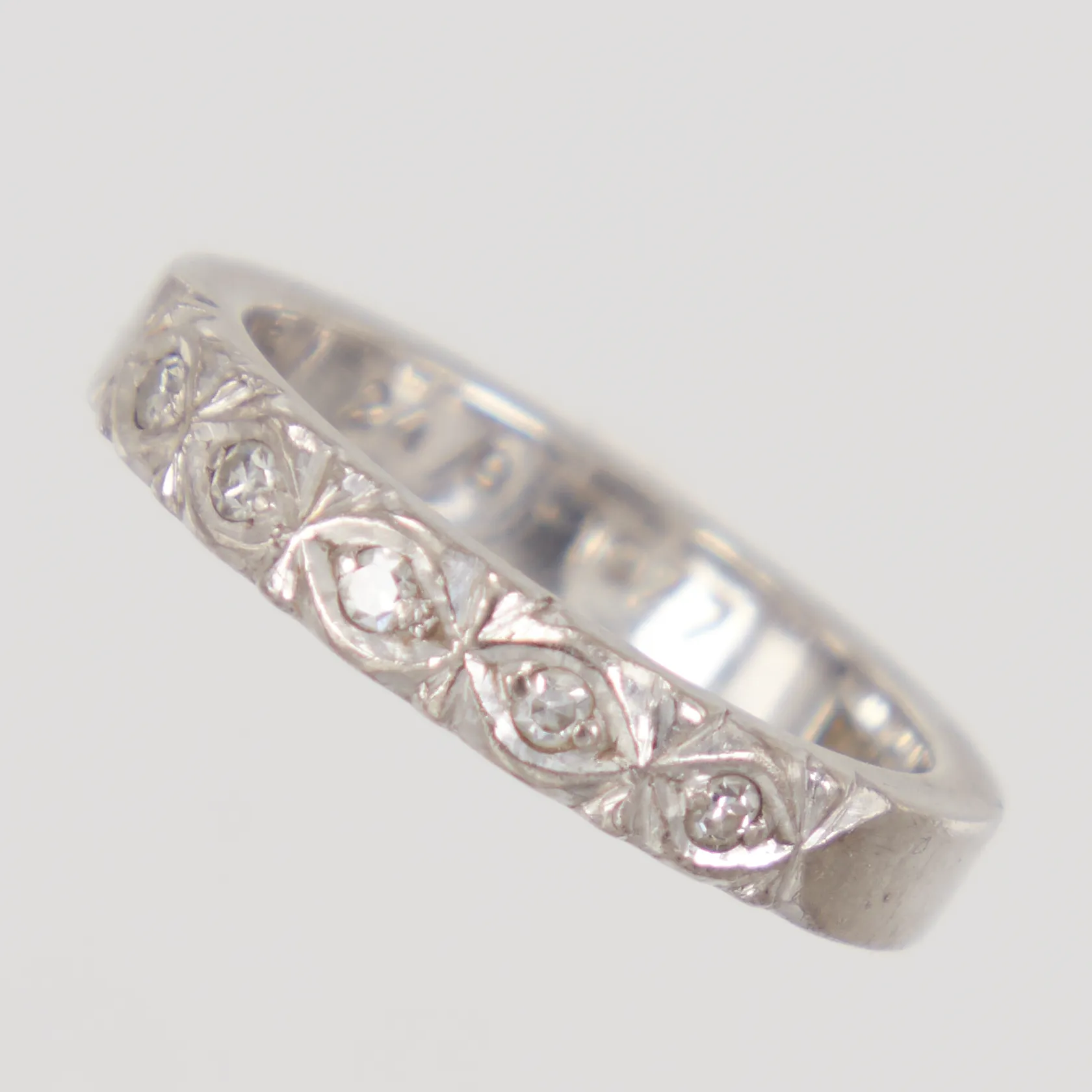 Ring, stl 15½, bredd 3,1mm, åttkantslipade diamanter 5x ca 0,005ct, gravyr, 18K vitguld, Vikt: 4,5 g.