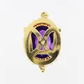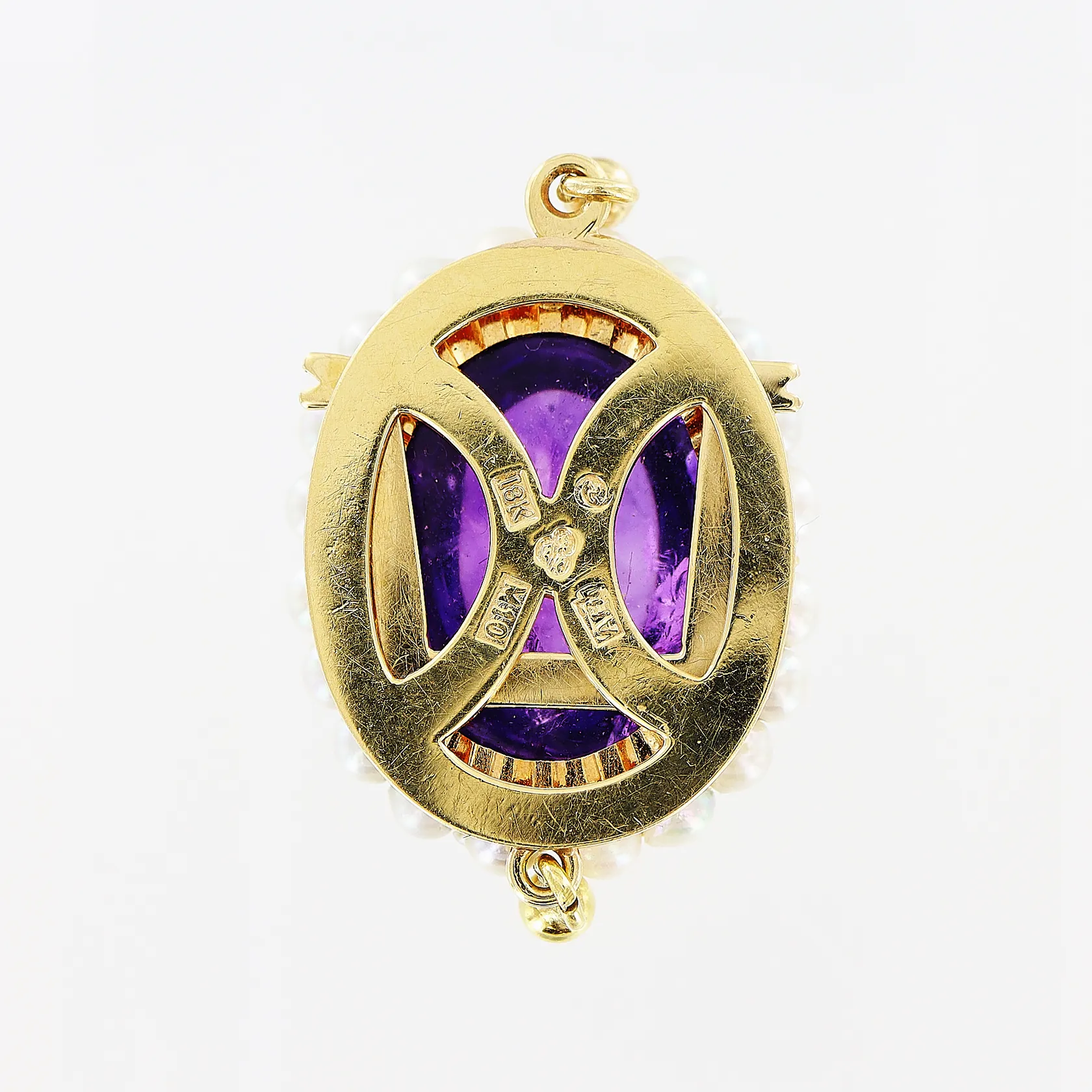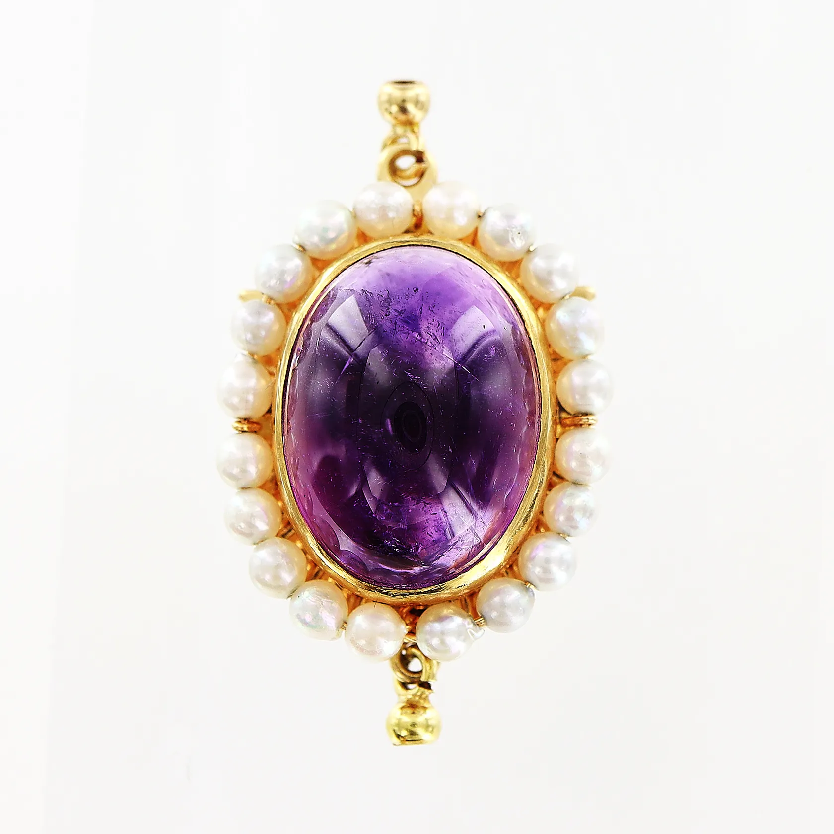 Lås med dobbar, cabochonslipad ametist 11x15mm, mindre odlade pärlor Ø2,5mm, 18K Vikt: 6 g.
