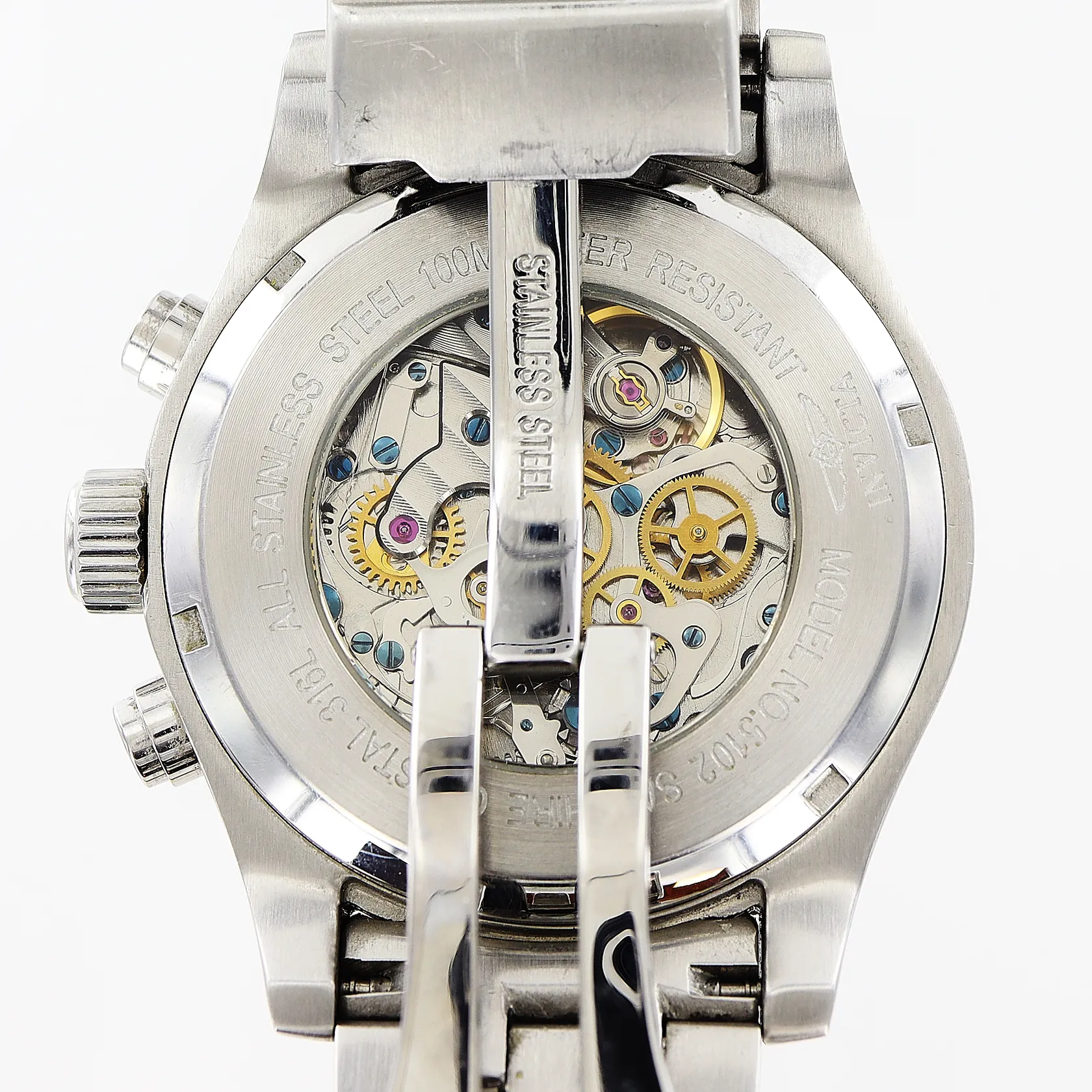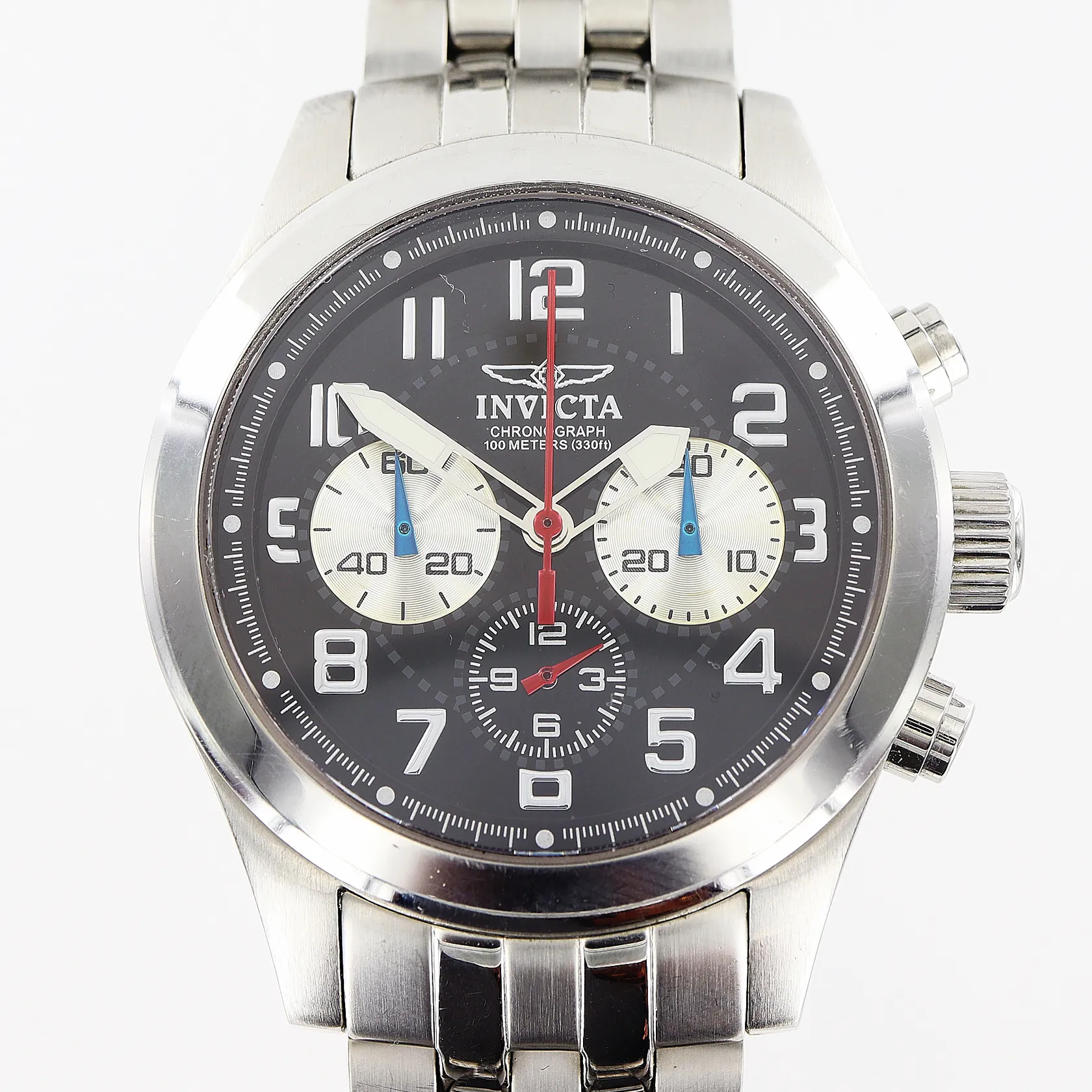 Herrur Invicta, stål, automatisk, Ø45mm, svart urtavla, kronograf, modell nr 5102, glasbaksida, länk 19,5cm, smärre repor/märken på boett/glasring, fodral, inga övriga tillbehör.