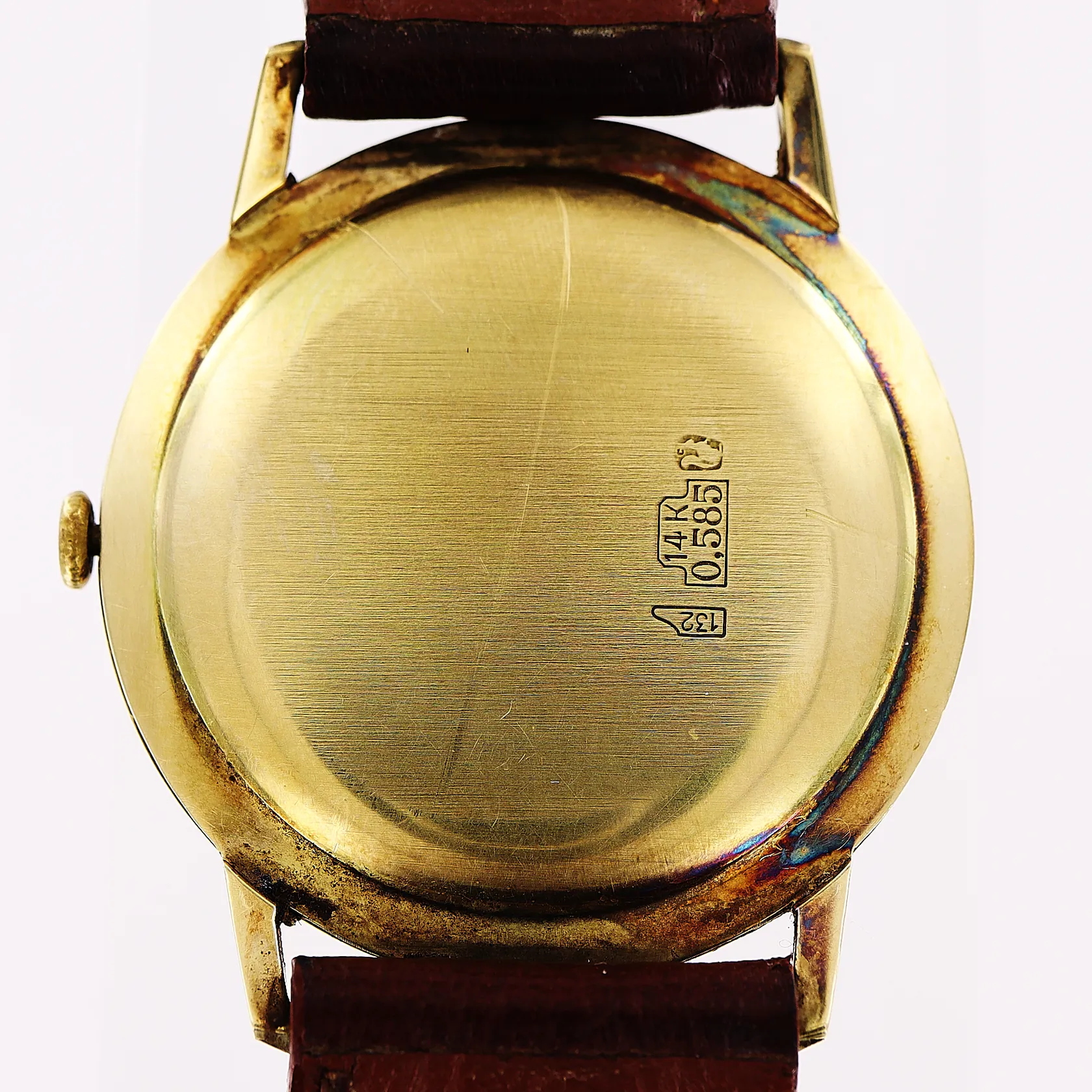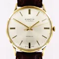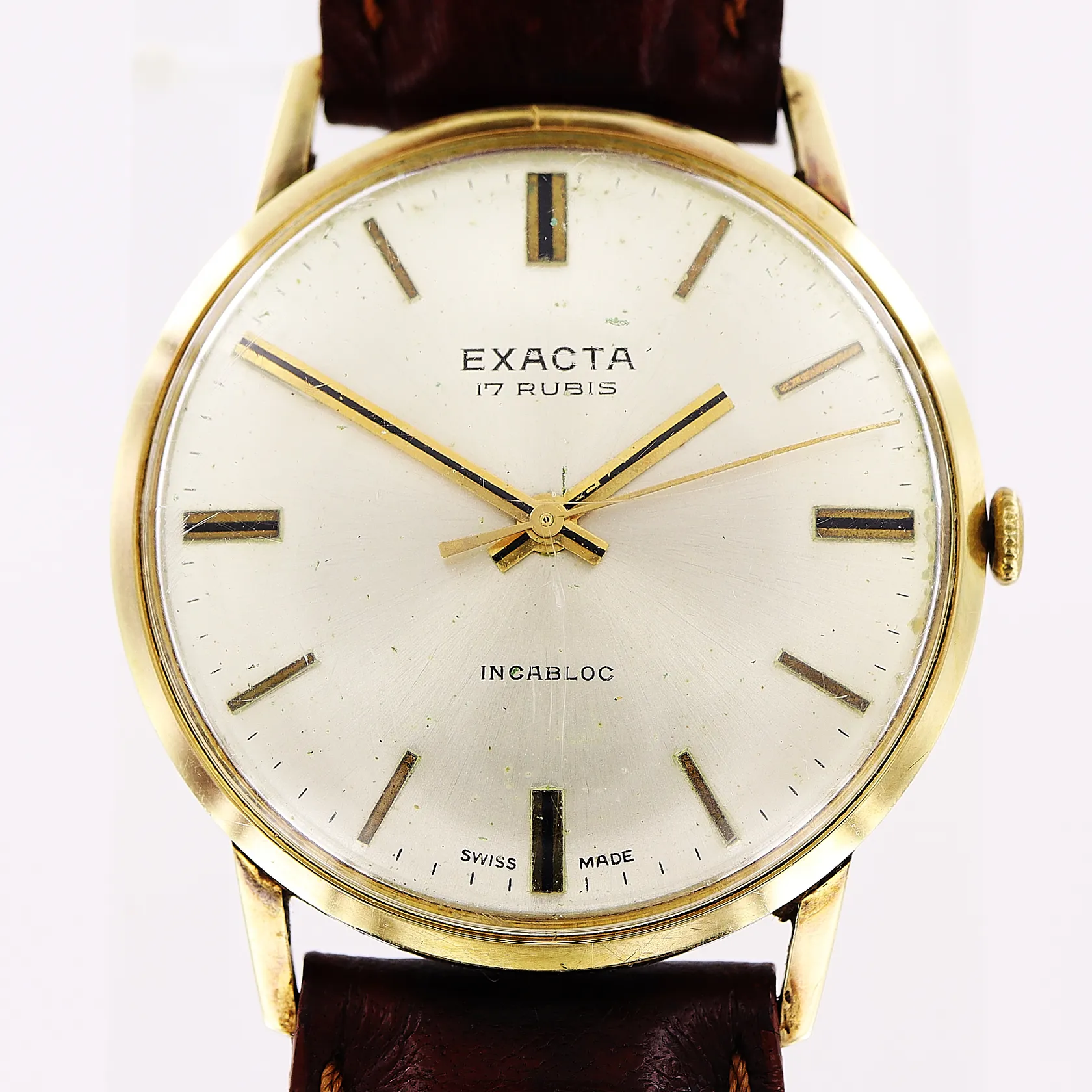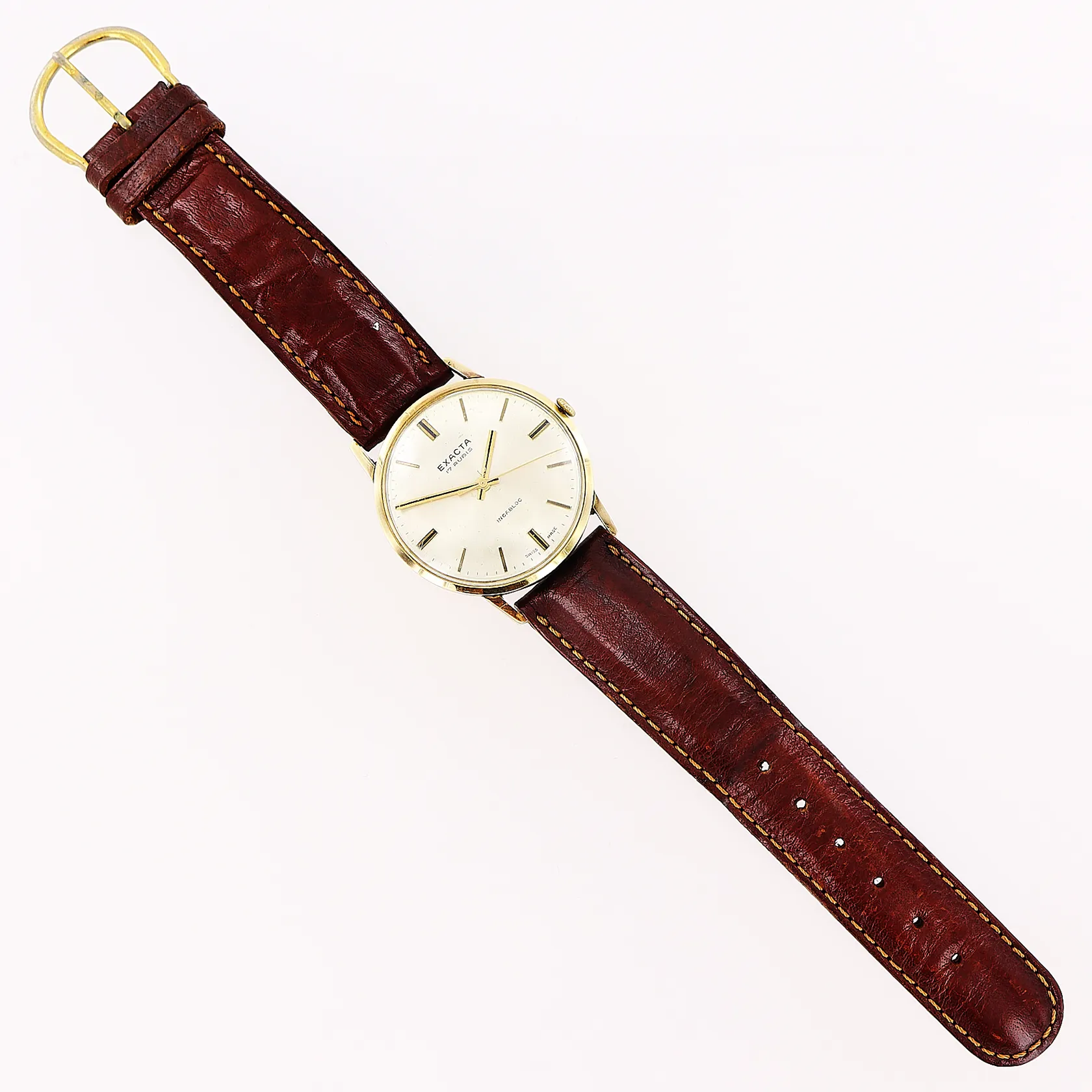 Herrur Exacta, 14K, manuell, Ø34mm, vit urtavla, sekundvisare, repor på glas och boett, brunt läderband ej original, bruttovikt 29,4g, inga tillbehör.