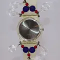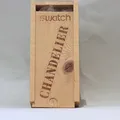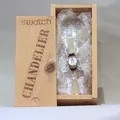 Armbandsur, Swatch "Chandelier", Ø 35mm, med detaljer av glas, armband av plast, i träbox med ställning av gjutet klarglas