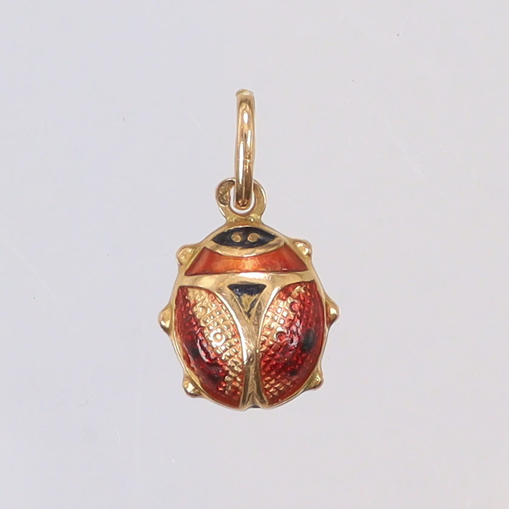 Hänge Nyckelpiga med emaljdetaljer (något sliten), 15x8mm inklusive hängöglan, 18K Vikt: 0,8 g.