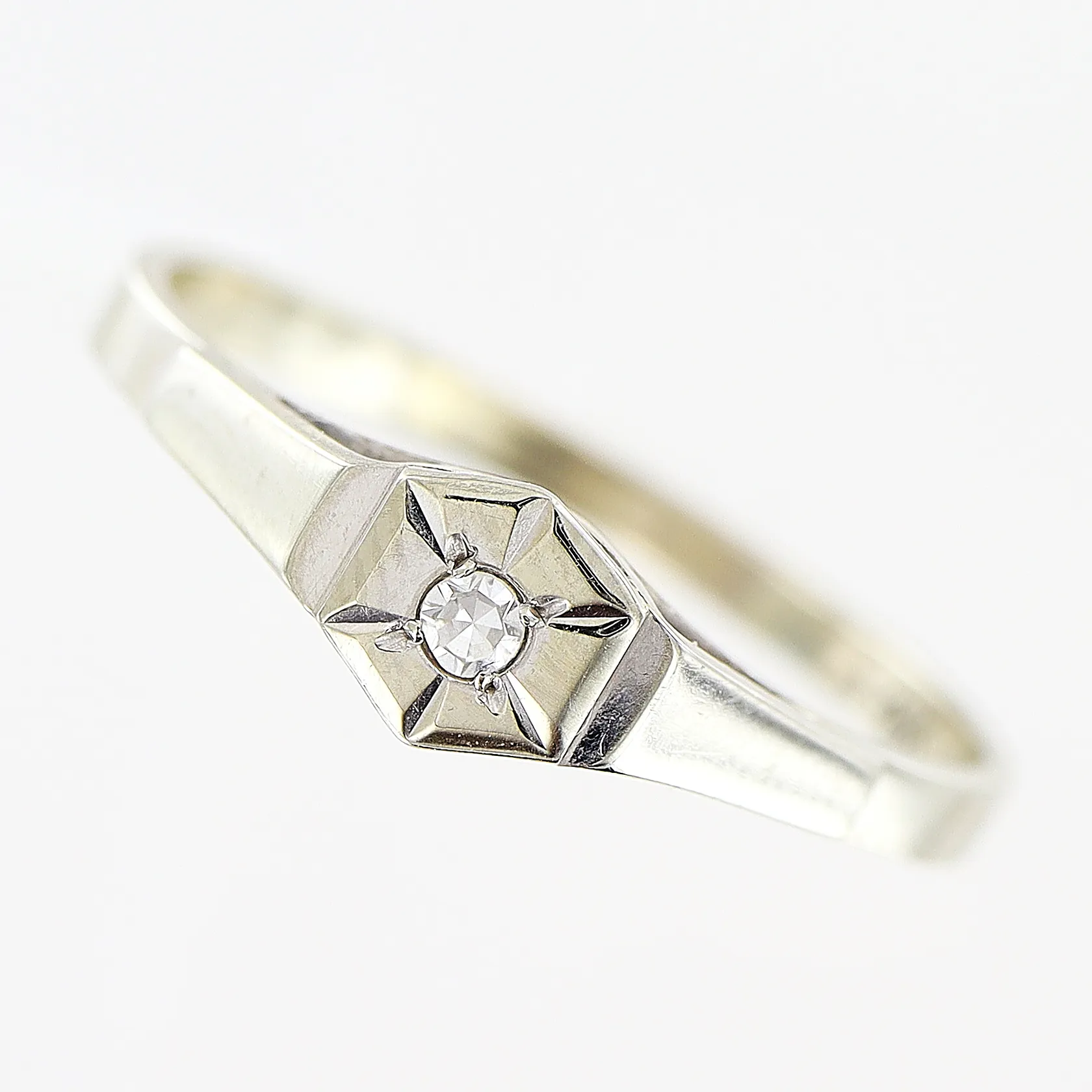 Ring, 8/8 slipad diamant ca 0,03ct, stl 18¾, bredd 1,5-5mm, vitguld, 18K Vikt: 2,1 g.