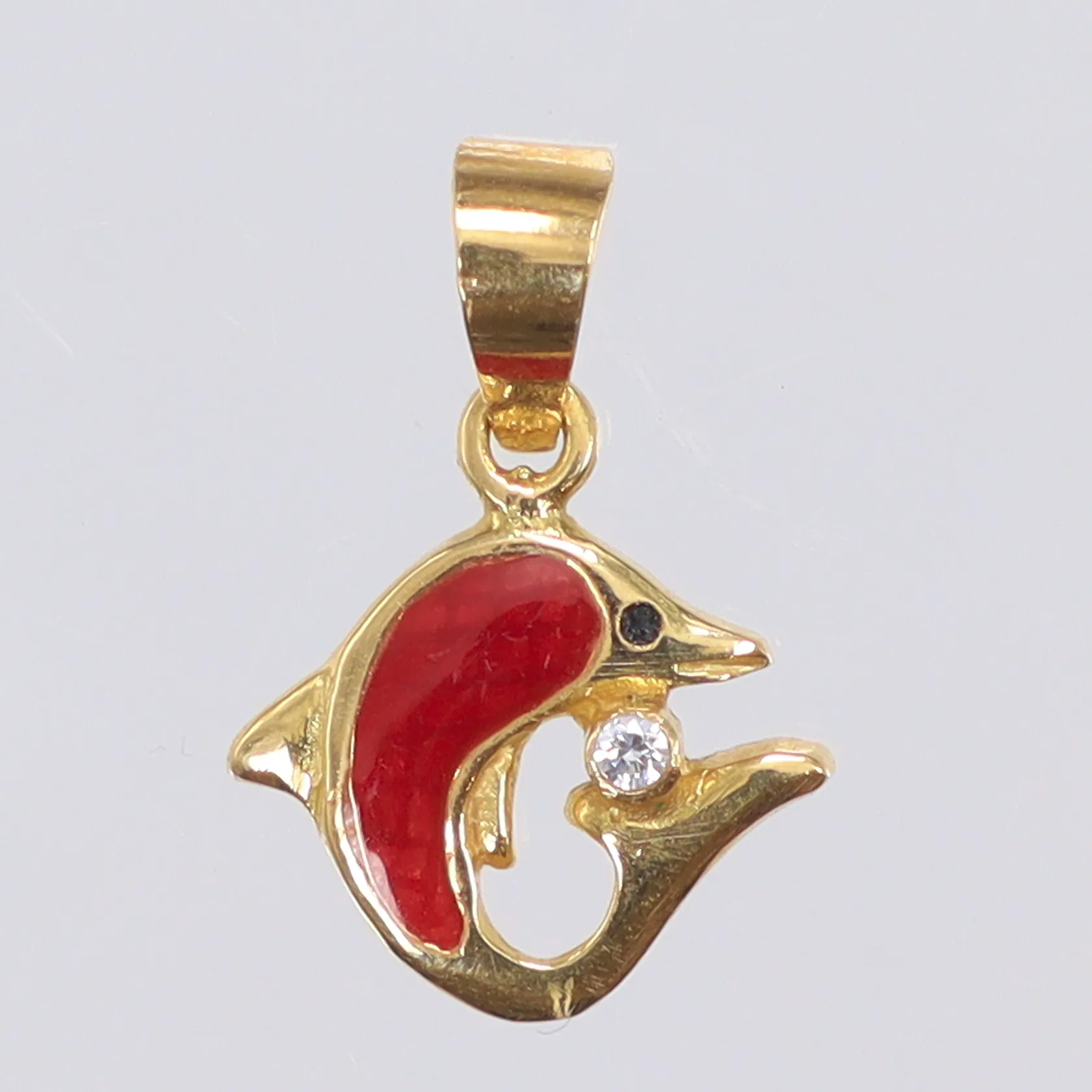 Hänge Delfin med röd emalj samt vit sten, 11x16mm inklusive hängöglan, 18K Vikt: 0,9 g.