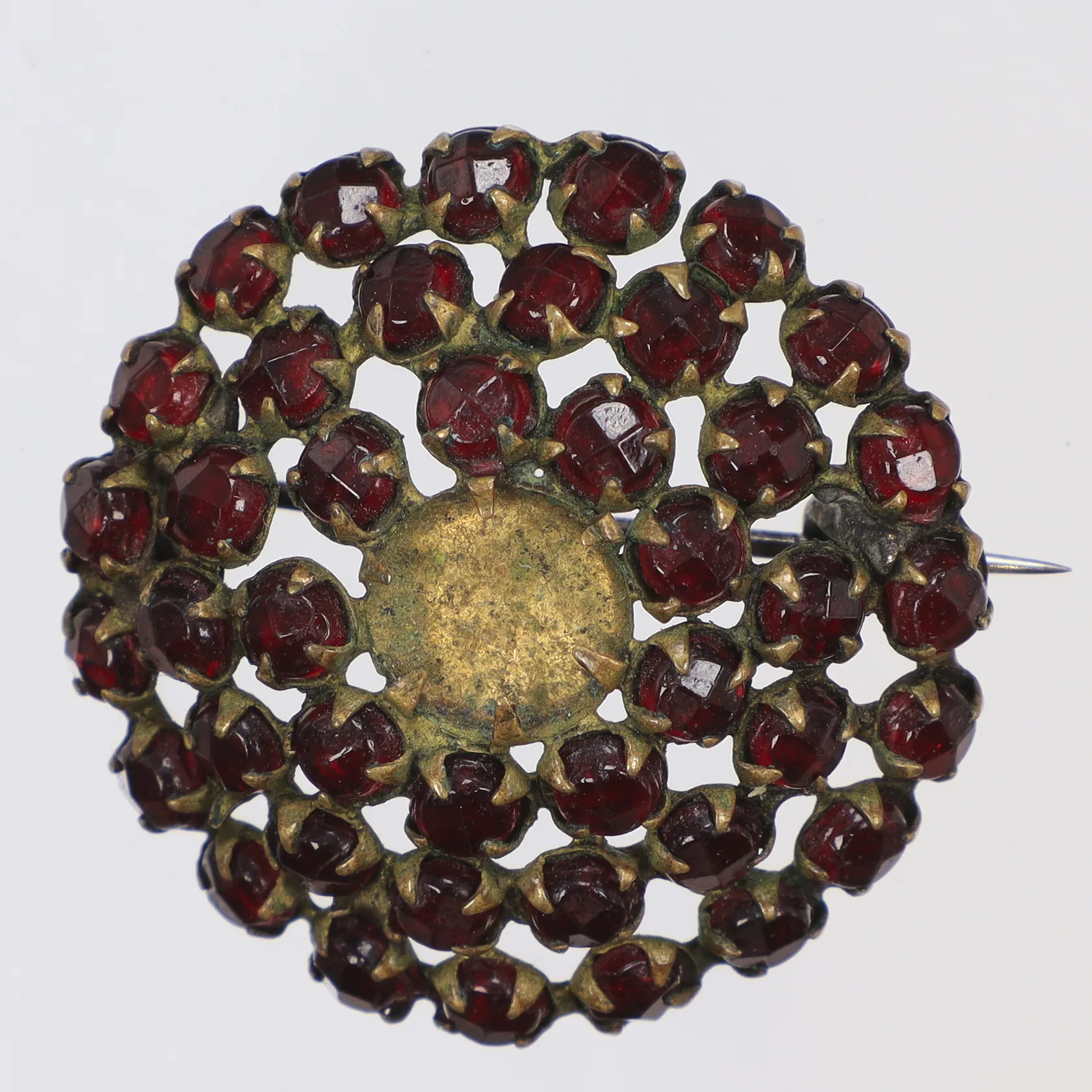 Brosch i gulmetall med röda stenar, möjligen granater (saknar mittsten) Ø30mm, 1900-talets första hälft