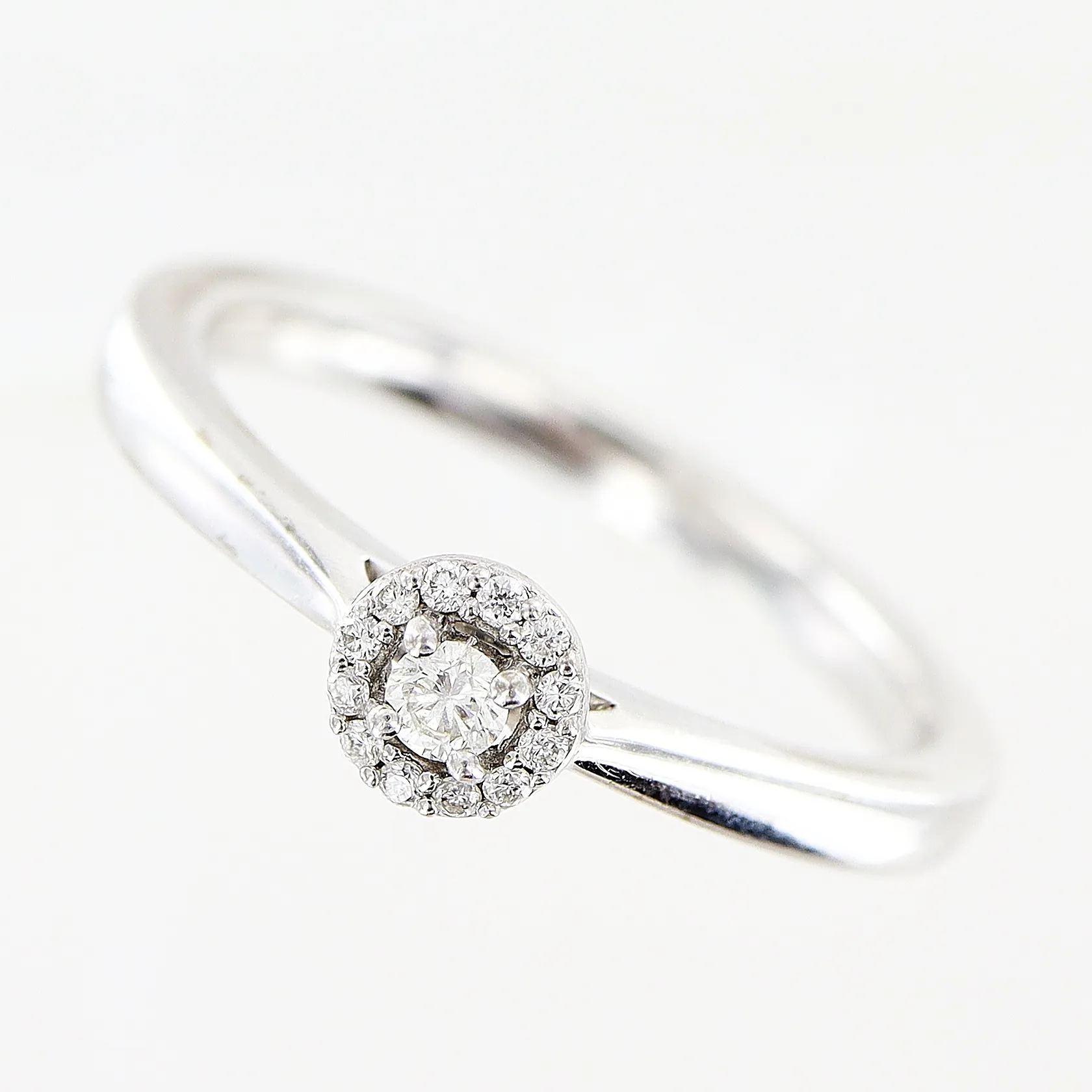 Ring, diamanter 1 x ca 0,05ct, ca 12 x ca 0,005ct, stl 16¾, bredd 2-5mm, vitguld, GHA, 18K. Vikt: 3,3 g.