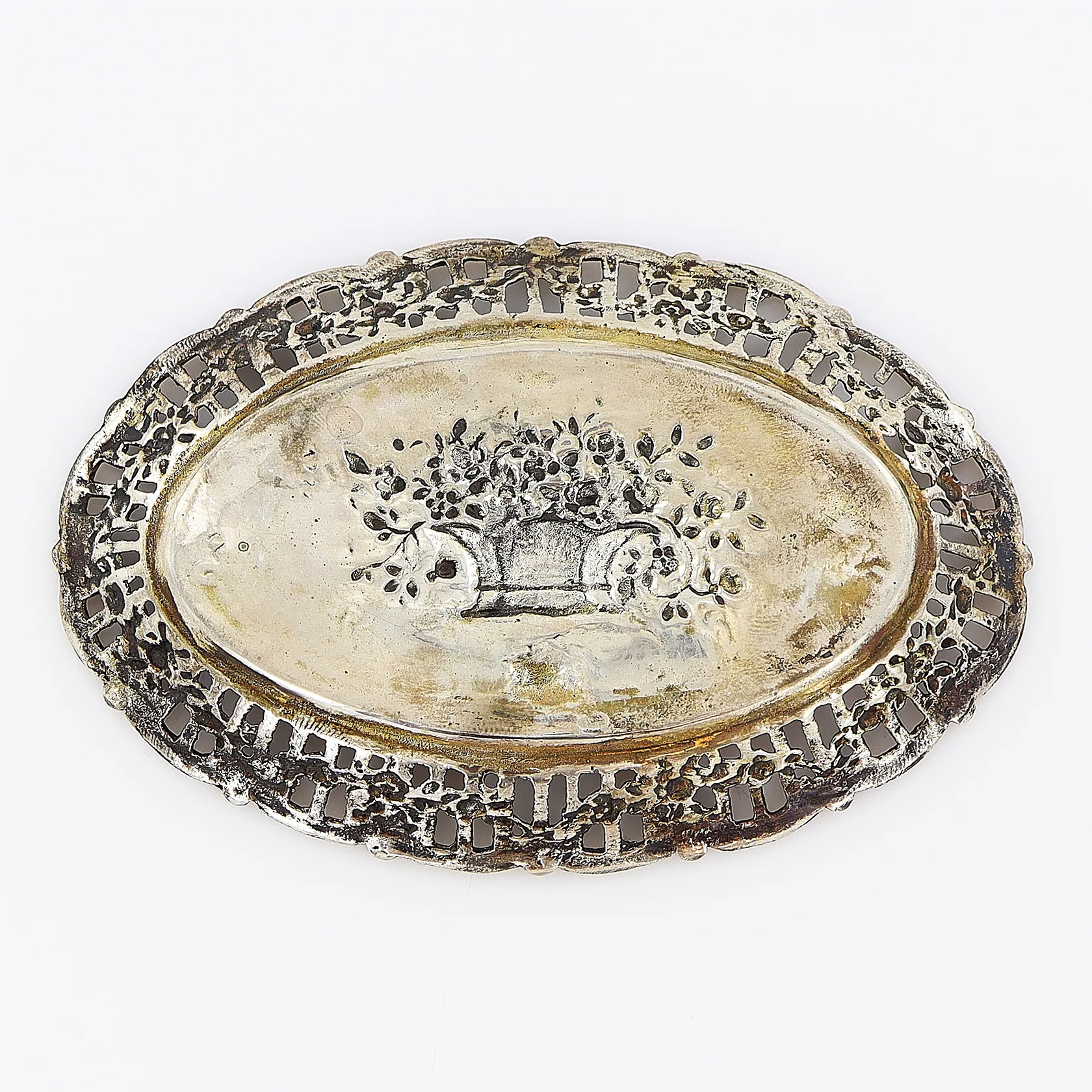 Fat med genombruten dekor, 108x70mm, svensk importstämpel, silver 830/1000. Vikt: 43,7 g.