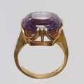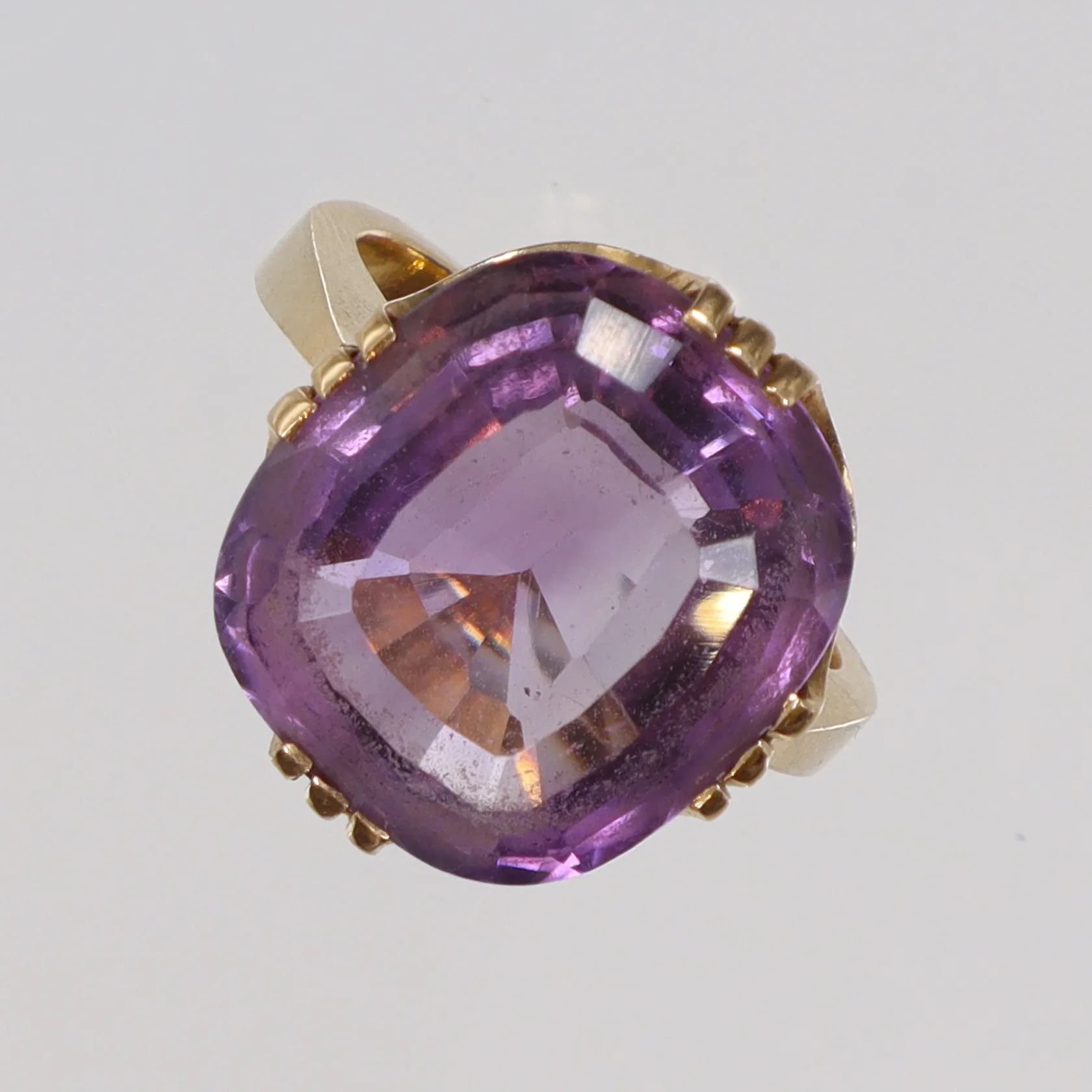 Ring med slipad lila sten, troligen amtetist, stl 15¾ bredd 2-17mm, otydlig tillverkarstämpel men årstämplad för år 1961, 18K Vikt: 9,2 g.