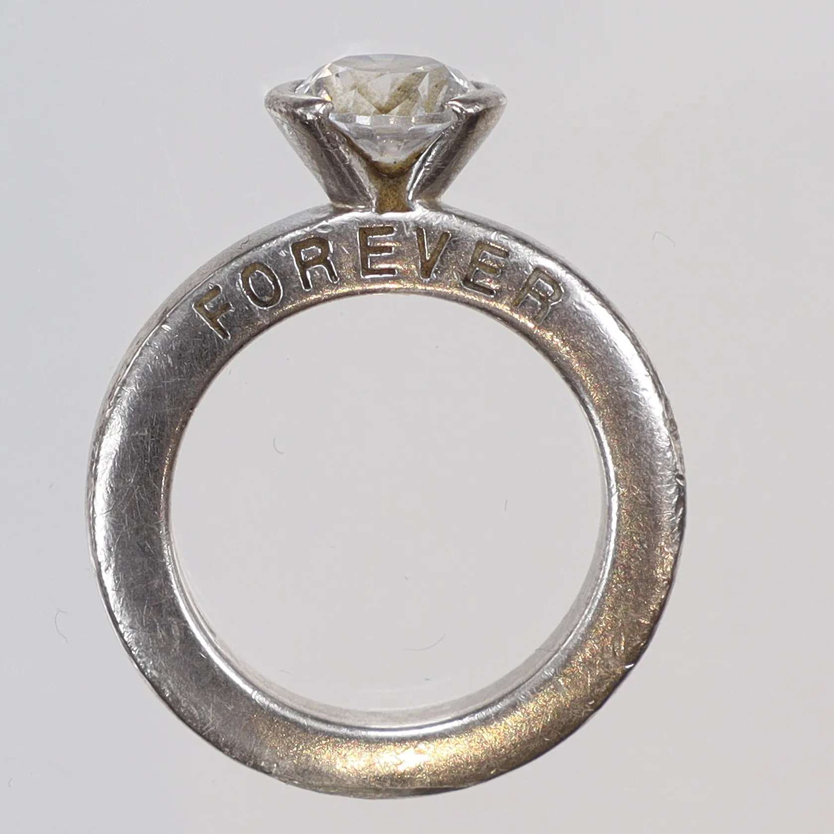 Ring med vit sten, stl 16, bredd 2-5mm, (GHA), text på sken: "forever", silver, 925/1000 Vikt: 6,9 g.