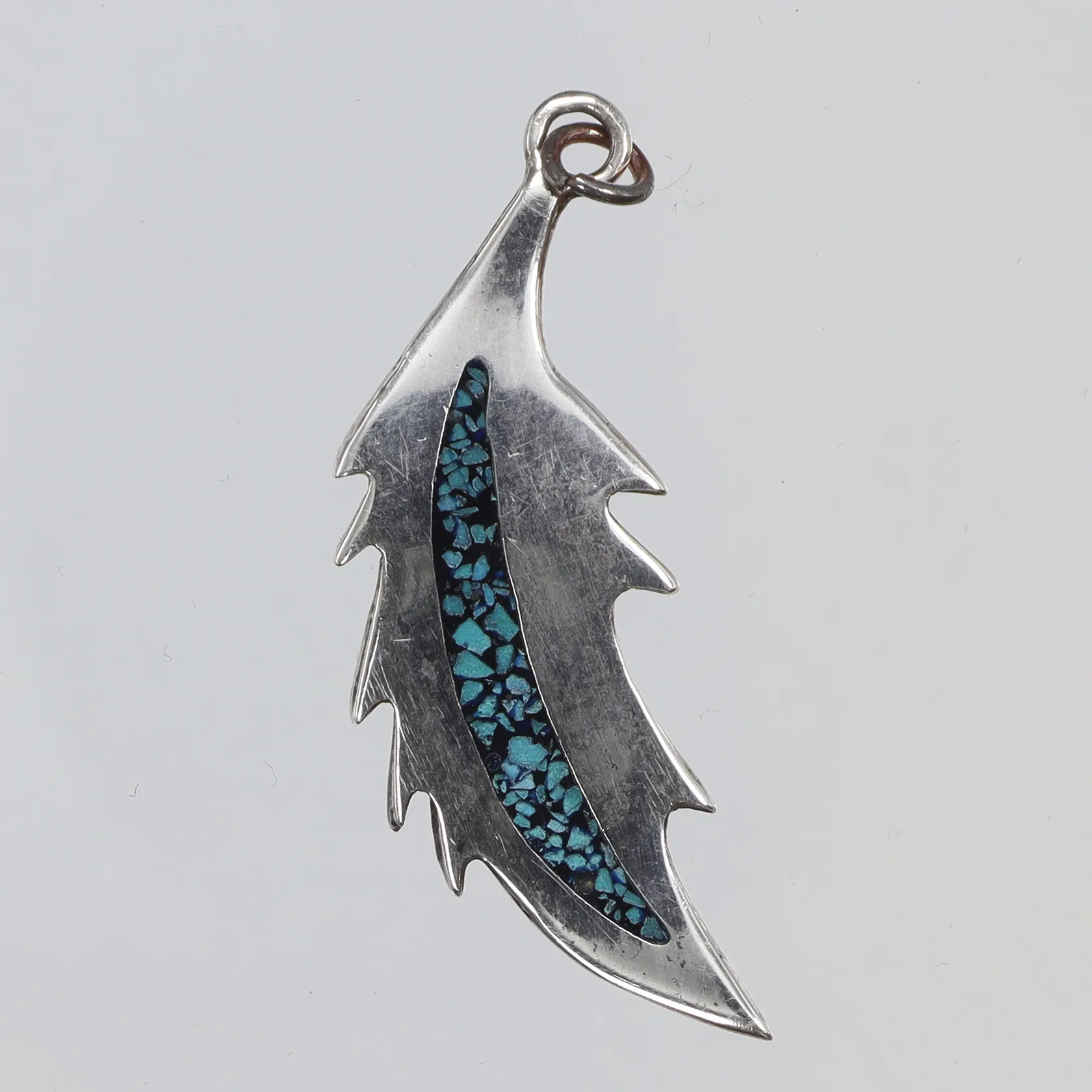 Hänge i form av fjäder med sten/emalj (liten skada) 14x42mm, silver 925/1000 Vikt: 3 g.