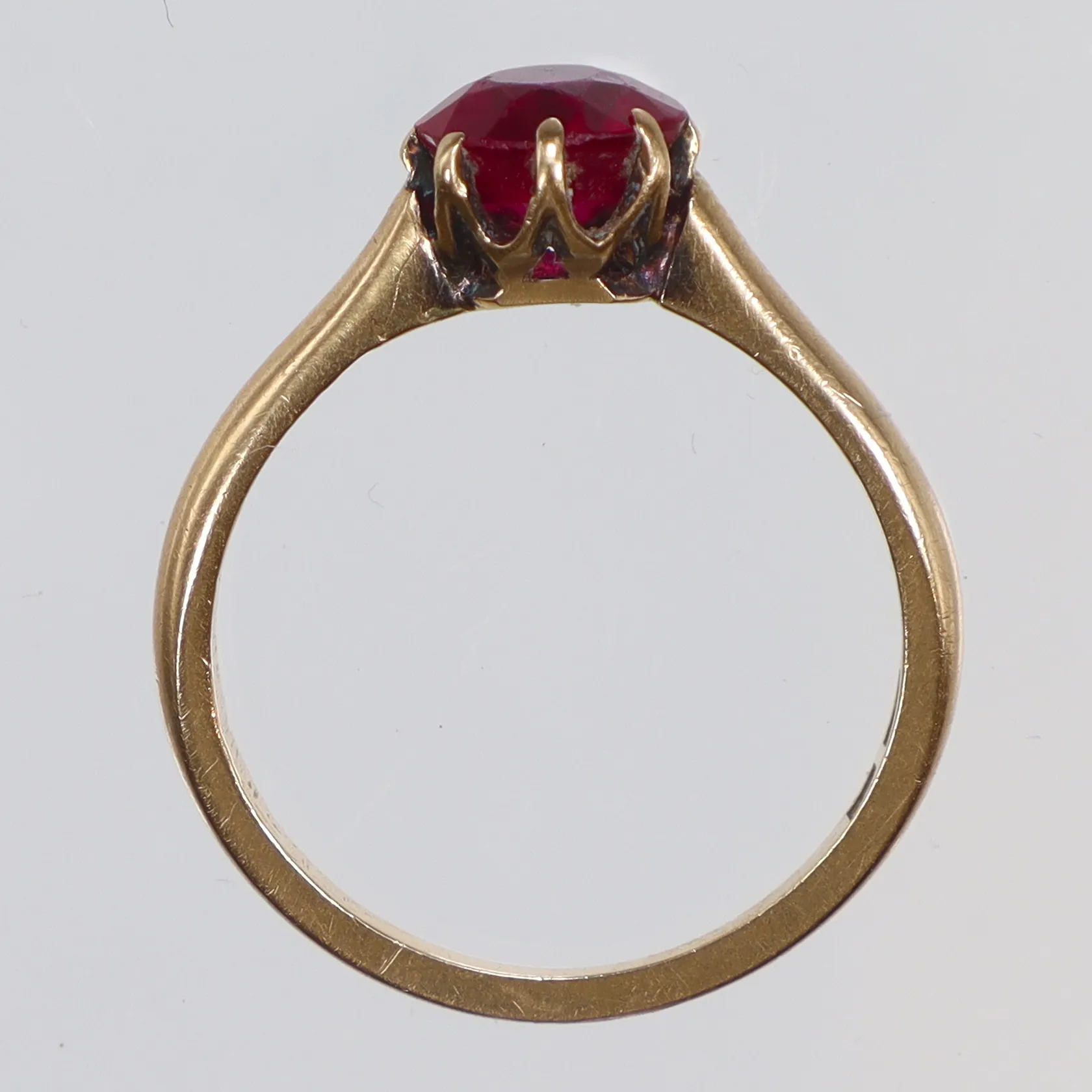 Ring med gammalslipad röd sten, stl 17, bredd 1-6mm, något otydlig tillverkarstämpel HC?, Göteborg 1932, 18K Vikt: 3,1 g.