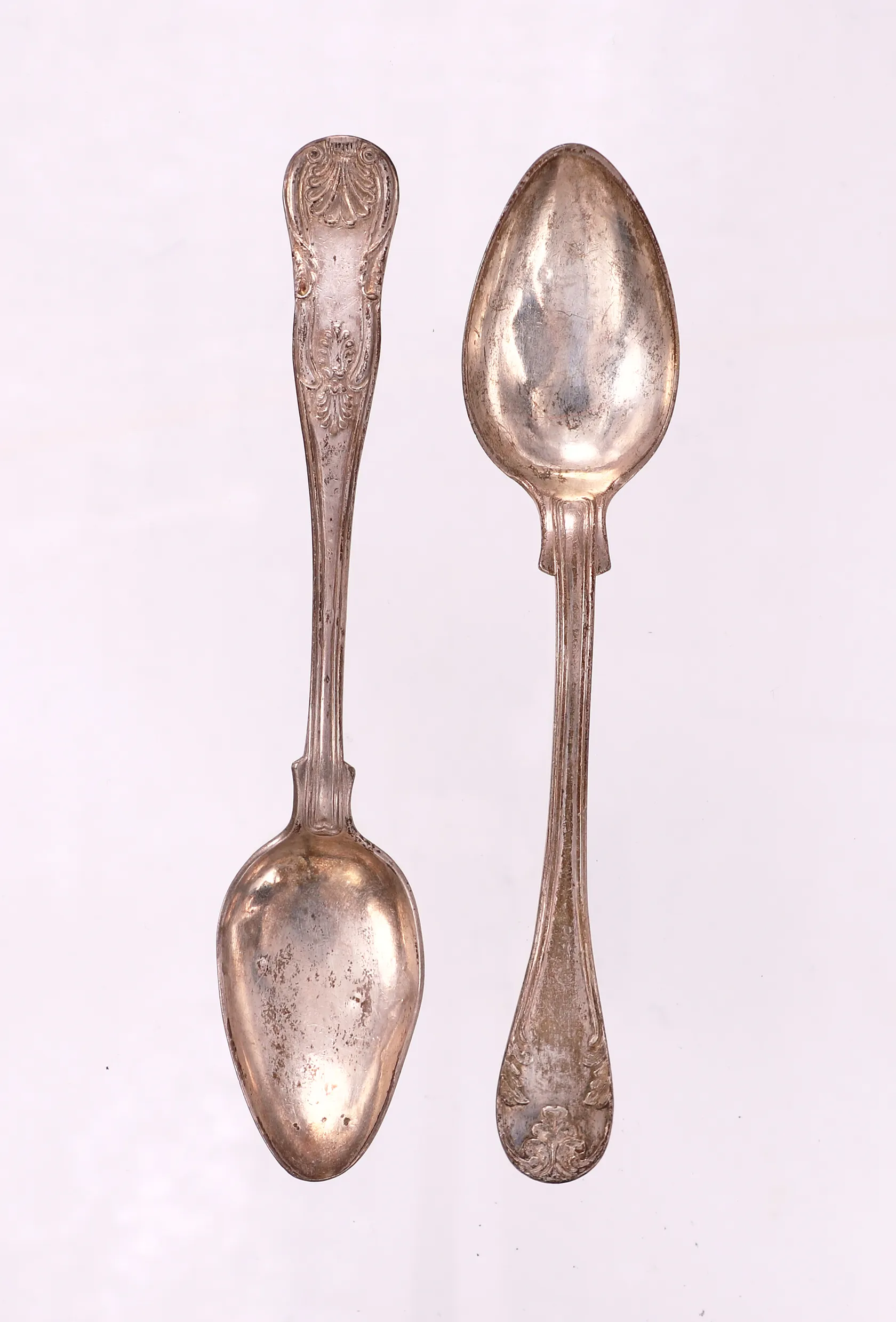 Två udda dessertskedar, längd 15cm, bucklor, gravyr, silver 830/1000 Vikt: 43 g.