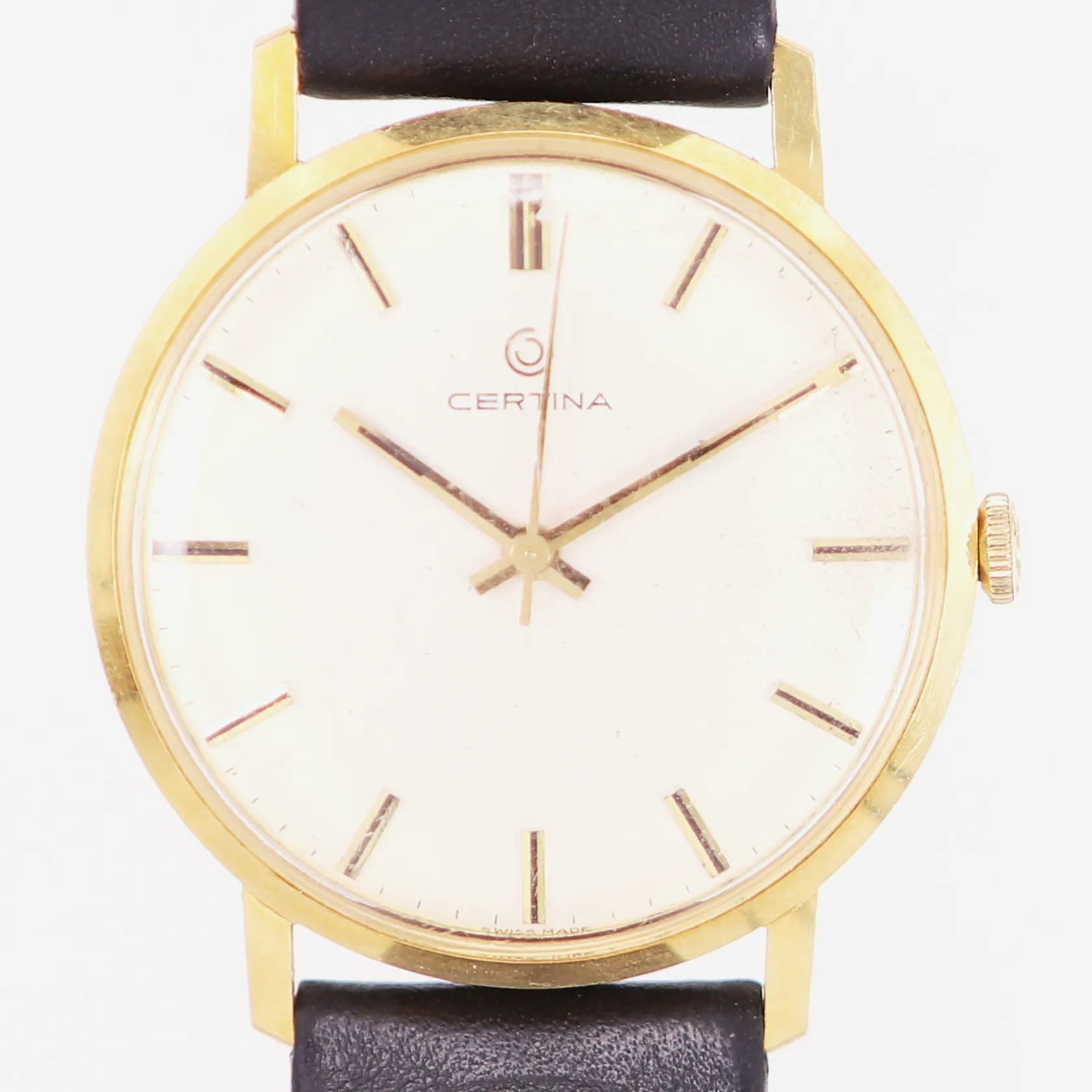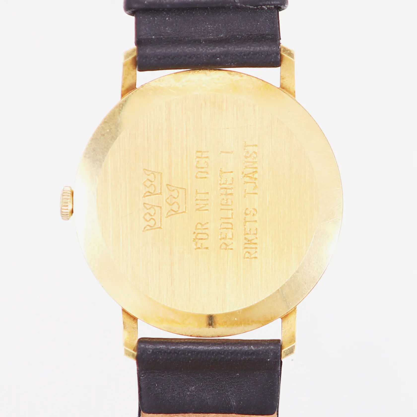 Herrur, Certina, Ø34mm, 18K, manuell, gravyr: "För nit och redlighet i rikets tjänst", svart, slitet läderband, slitet plexiglas, bruttovikt: 32,3g.