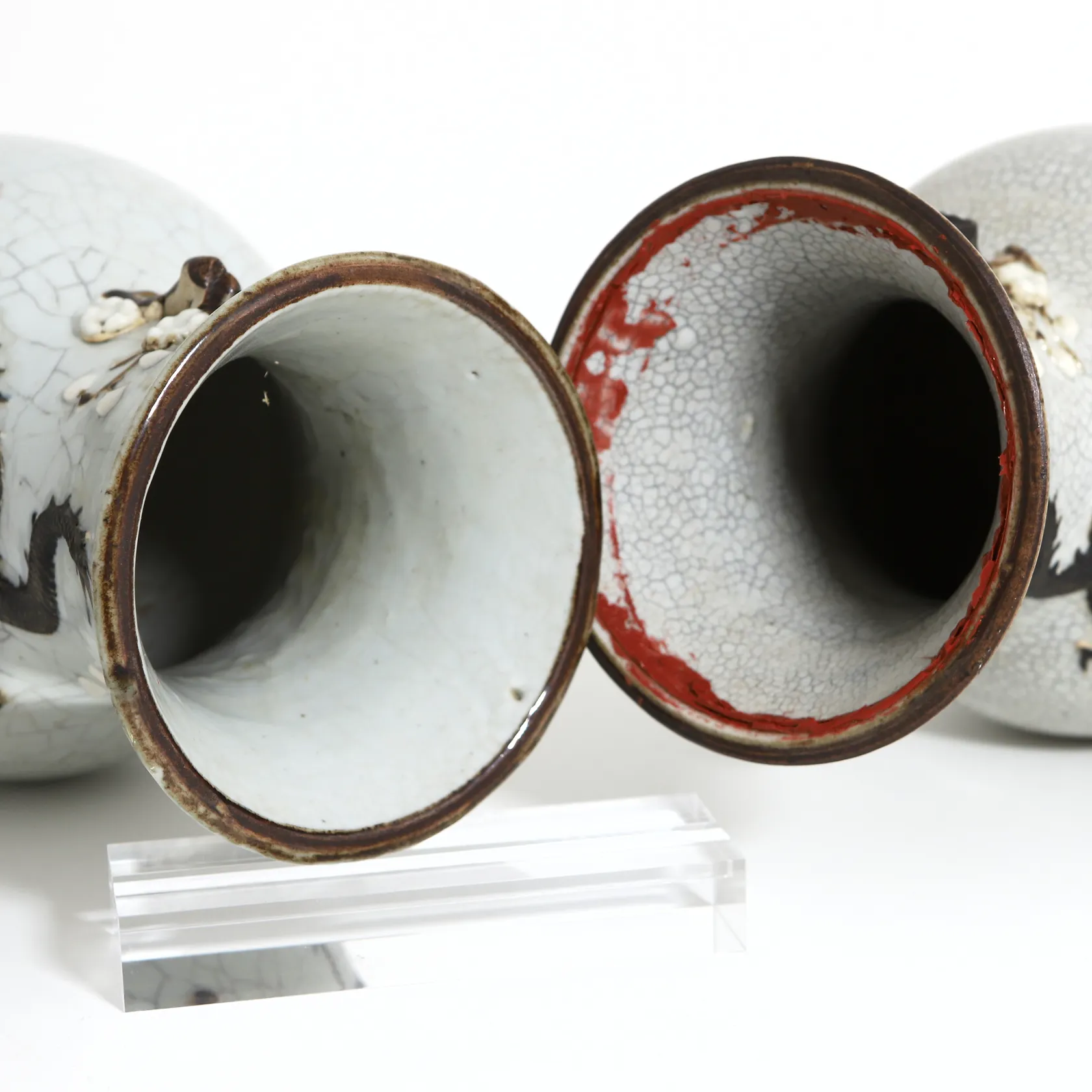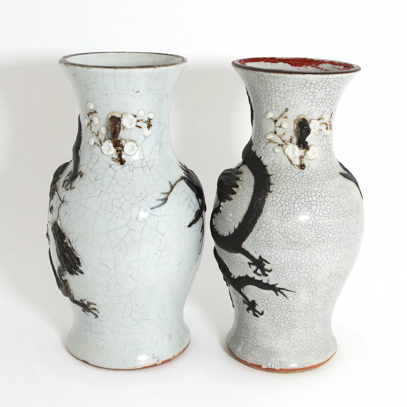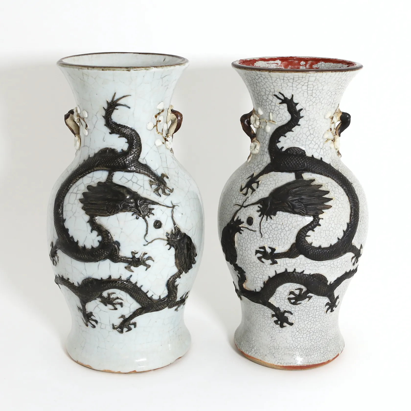 Ett par vaser med krackelerad design, drakar i relief som jagar pärla, Kina, 1800-talets slut, höjd 35 cm, märkning i botten, En vas med gummirester vid mynning samt en vas med stjärnspricka i botten Skickas med postpaket.