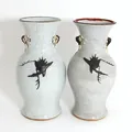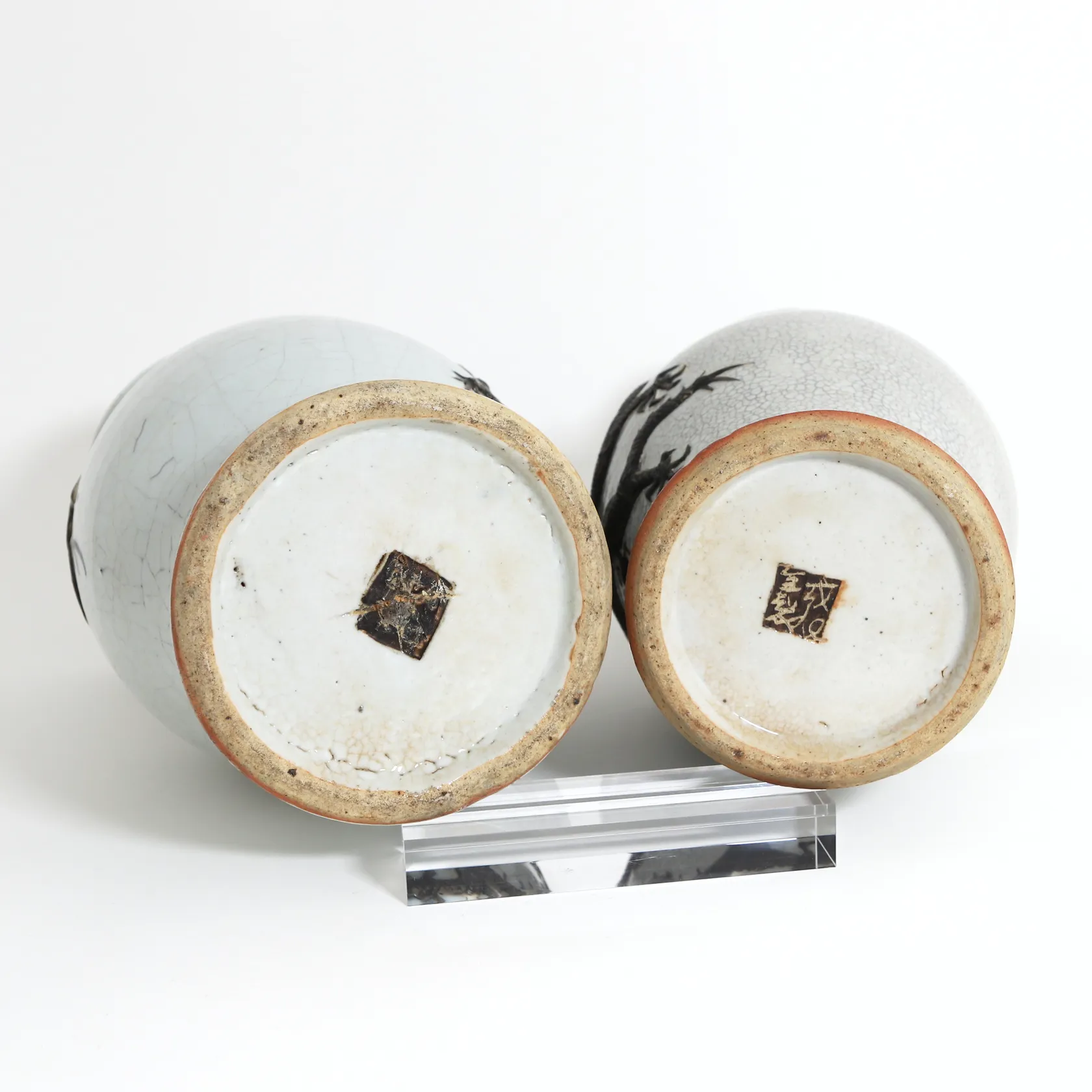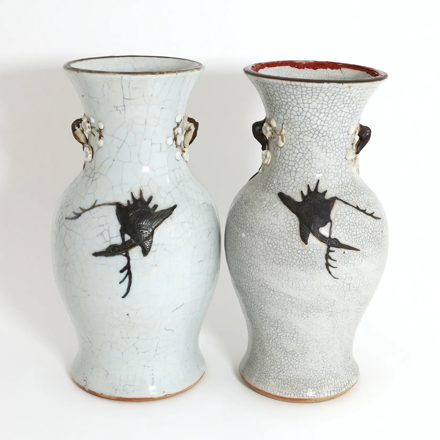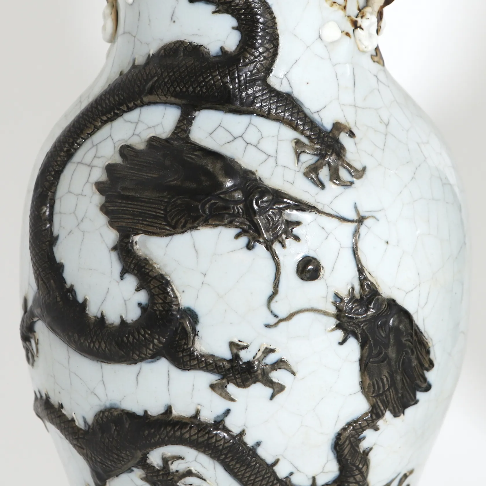 Ett par vaser med krackelerad design, drakar i relief som jagar pärla, Kina, 1800-talets slut, höjd 35 cm, märkning i botten, En vas med gummirester vid mynning samt en vas med stjärnspricka i botten Skickas med postpaket.