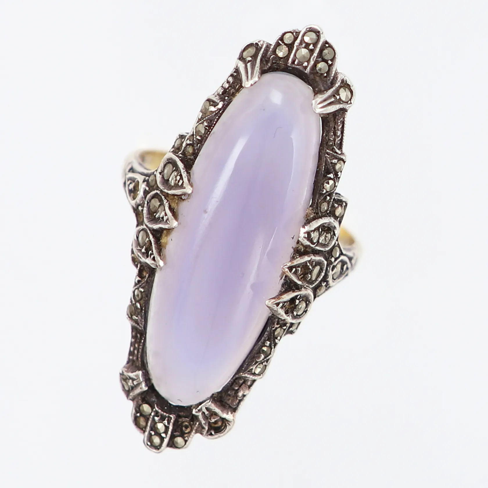 Ring med lila sten samt markasiter, stl 16, bredd: 1,5-34mm, fattning i silver, skena i 18K, lös sten, markasiter saknas, Bruttovikt: 5,0 gram Vikt: 5 g.