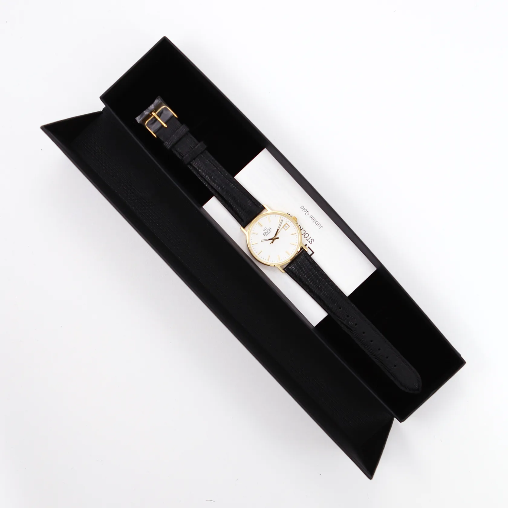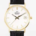 Herrur Epoch Stockholm, Ø34mm, boett 18K, Quartz, datum, svart läderarmband, box, inköpt på Bernhard Huke 29/11 2024, nyskick, gravyr baksida "Malmö Stad 2024"