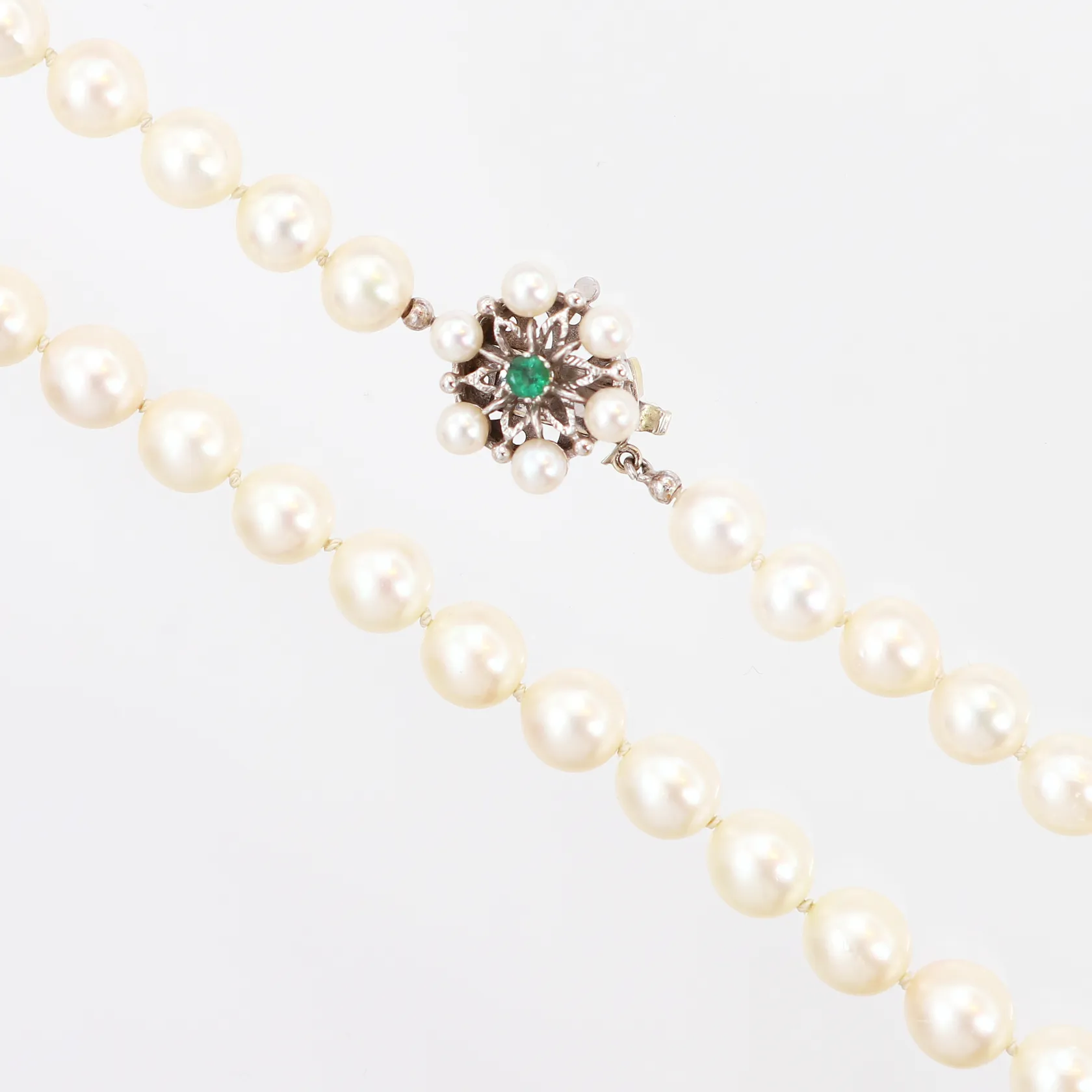 Pärlcollier med odlade pärlor, Ø7,5mm, ca 67cm, lås i vitguld, grön sten, lås ca 5,0 gram, 18K