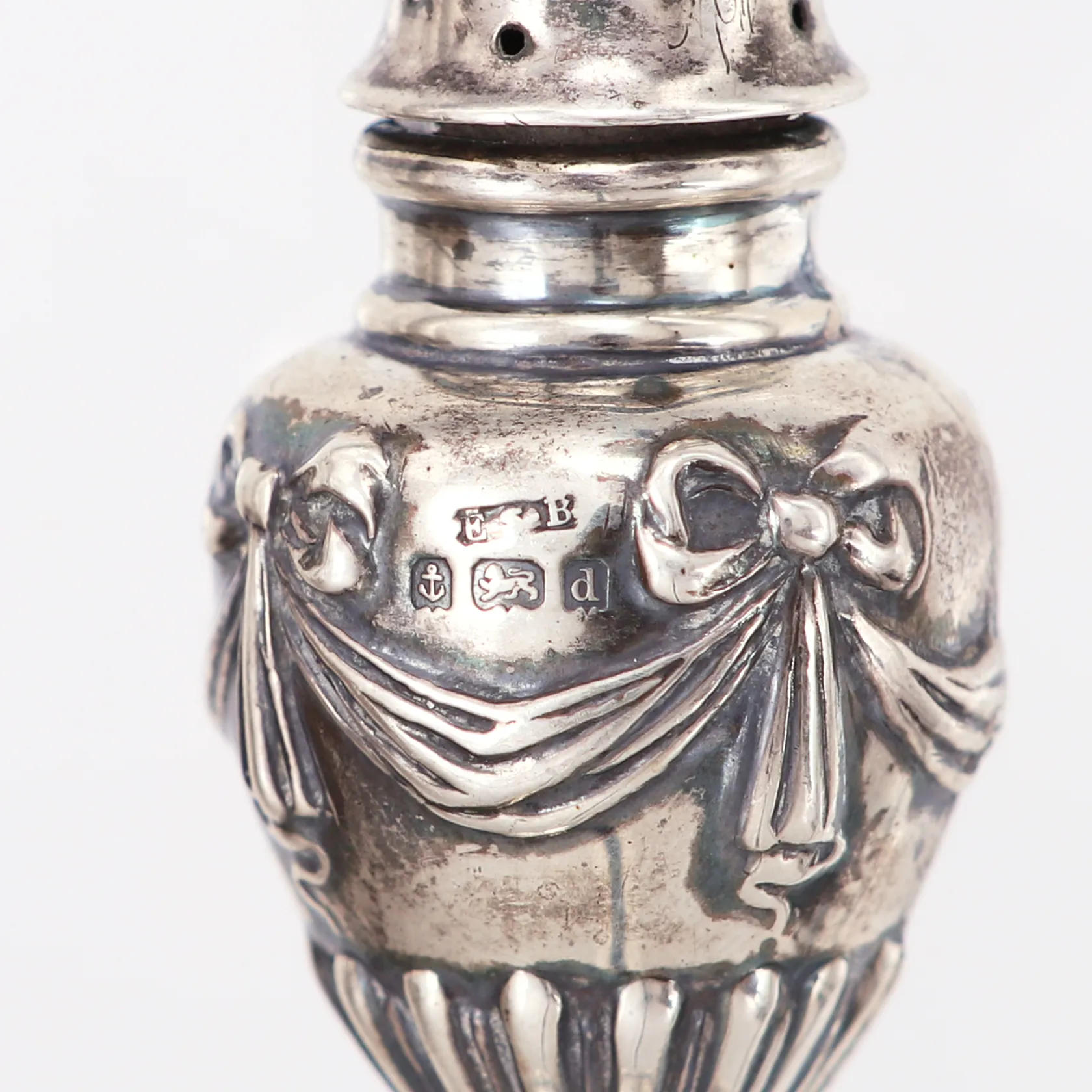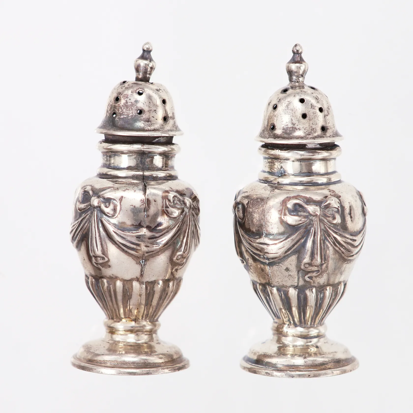 Två ströare i form av urnor, höjd: 7,5cm, Engelska kontrollstämplar, silver 925/1000 Vikt: 39,4 g.