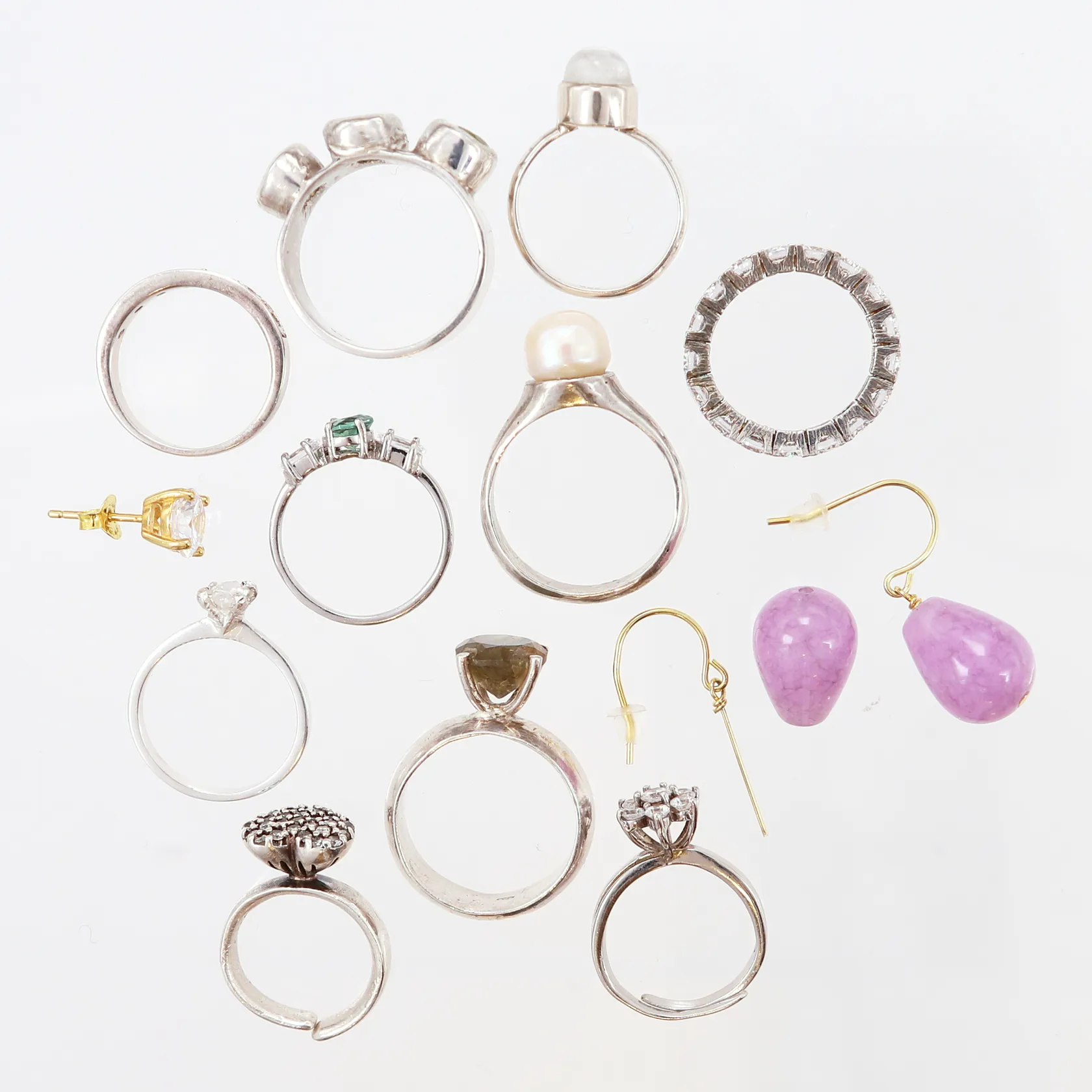 10 ringar, stl 13-17¾, ett par örhängen med stenar, ett defekt, ett udda örhänge med sten Ø7mm, silver 925/1000 Vikt: 41,6 g.