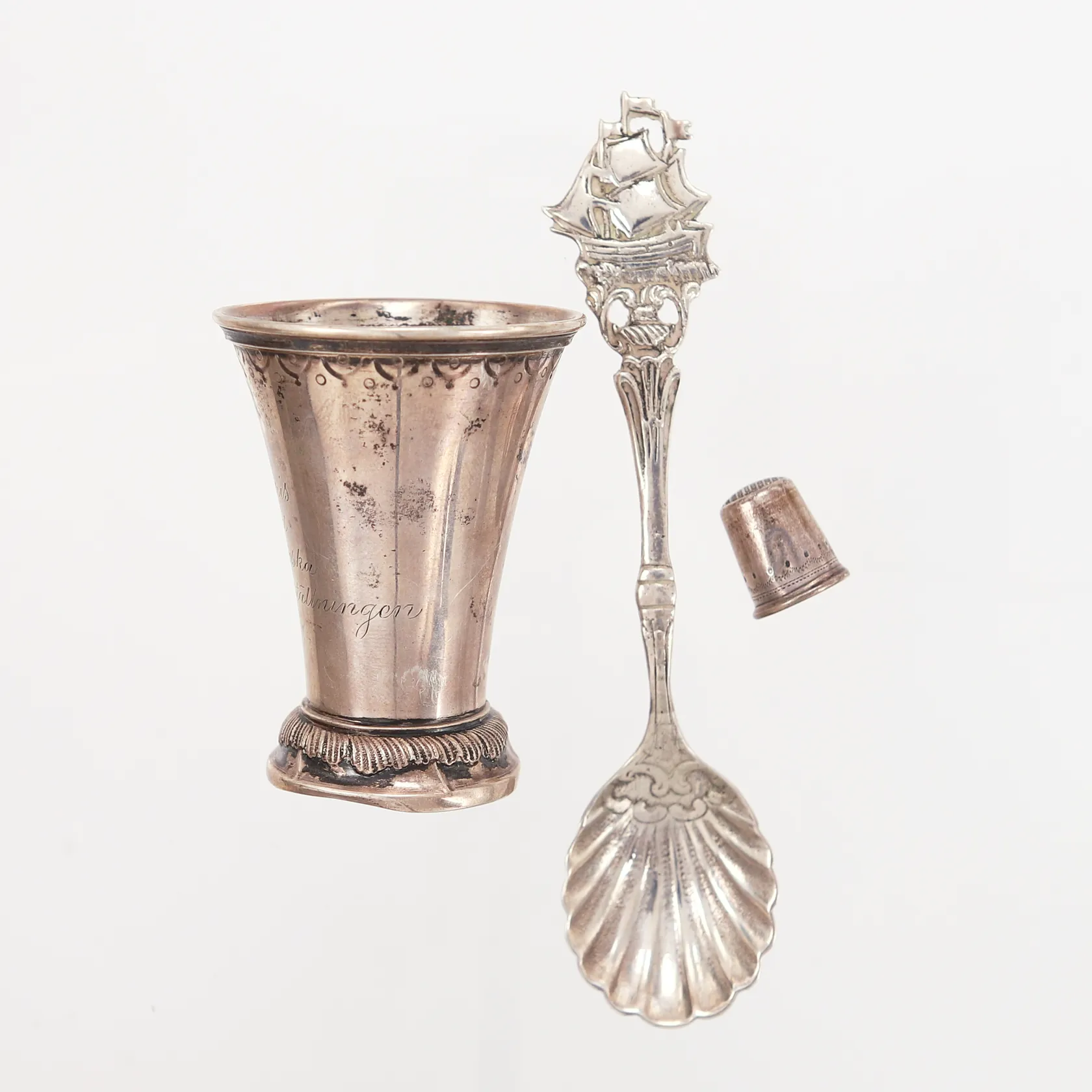 Bägare, 65mm, Ø48mm, gravyr, fingerborg, 17mm, Ø19mm, skevheter, sked 13cm, silver 830/1000 Vikt: 43,6 g.