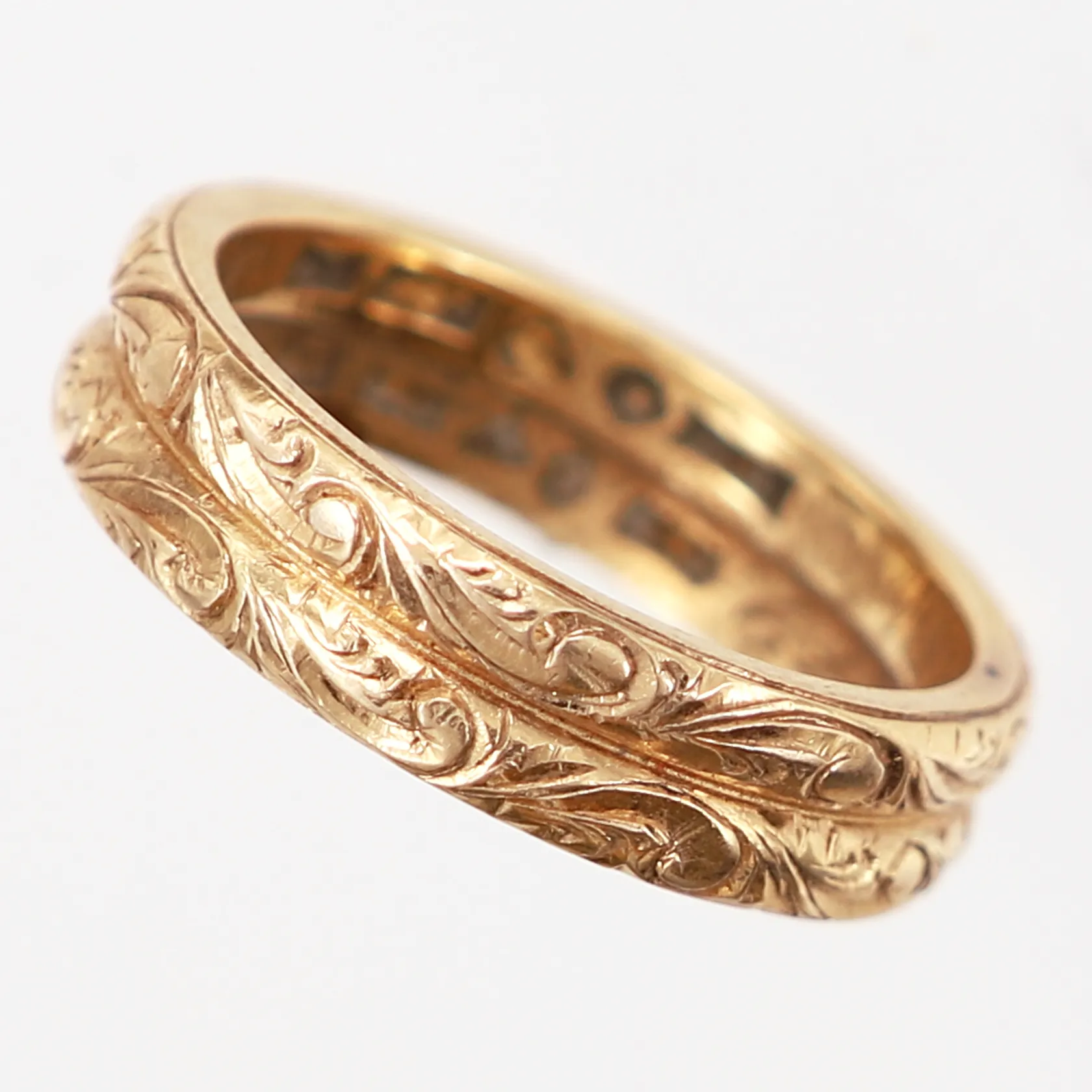 Ring, mönstrad stl 18½, bredd: 6mm, graverad, 18K Vikt: 8,4 g.