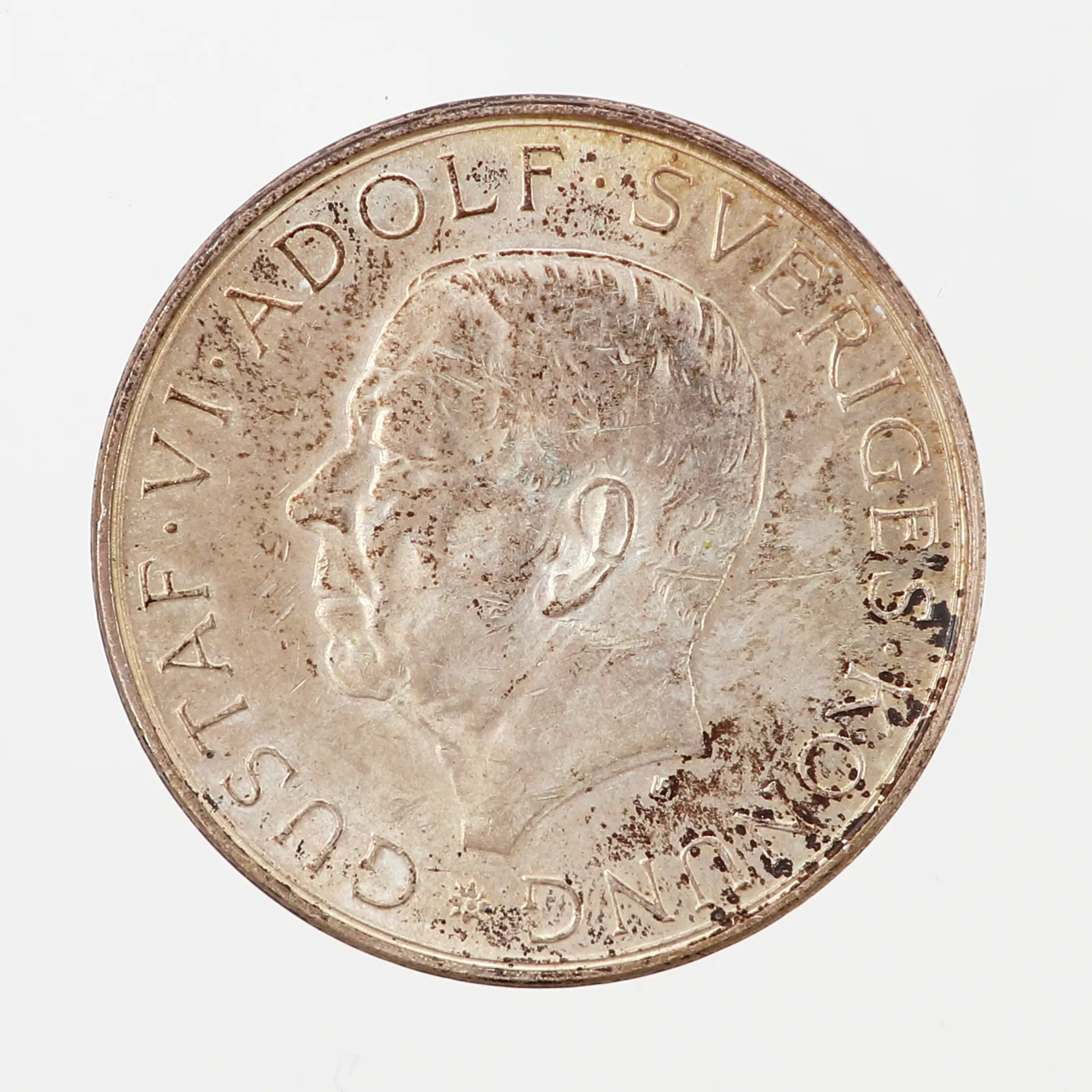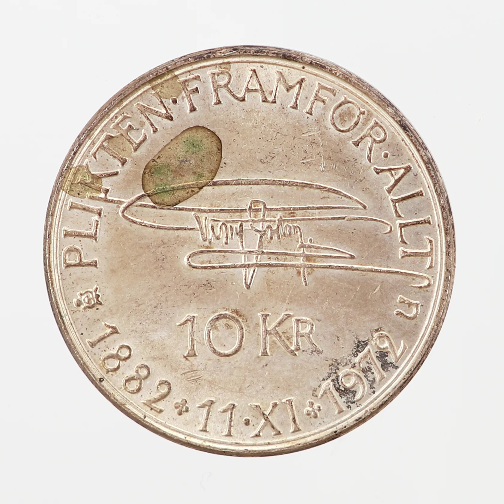 Mynt Gustaf VI Adolf, Sveriges Konung, 10kr Plikten framför allt, år 1972, Ø32mm silver 835/1000 Vikt: 17,9 g.
