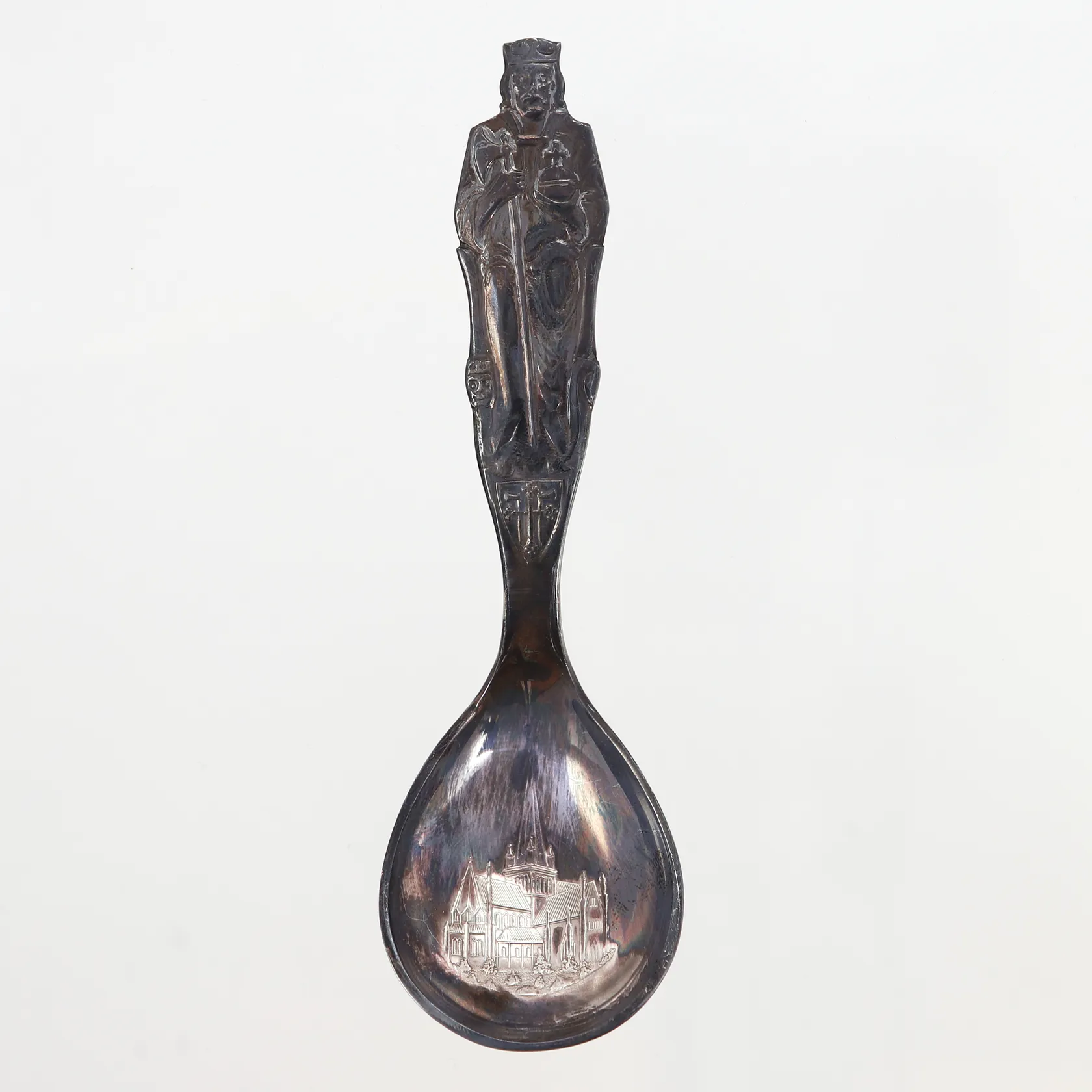 Sked med motiv av kung och kyrka, 12cm, silver 830/1000 Vikt: 25,2 g.