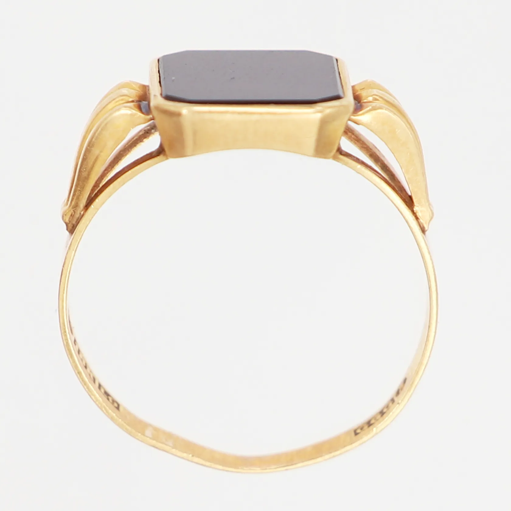 Klackring med onyx, 19¼, bredd: 2-13mm, skev skena, 18K Vikt: 2,9 g.