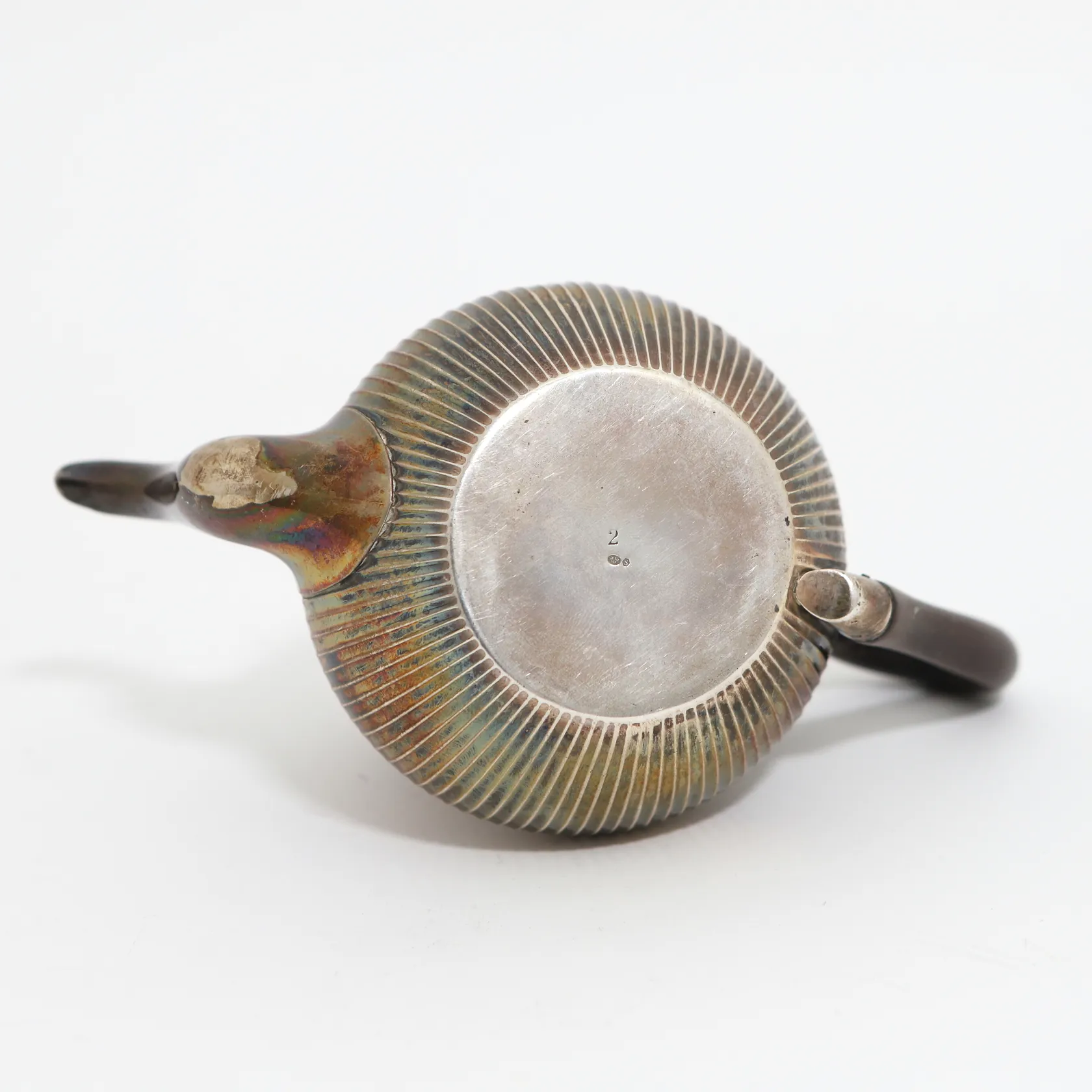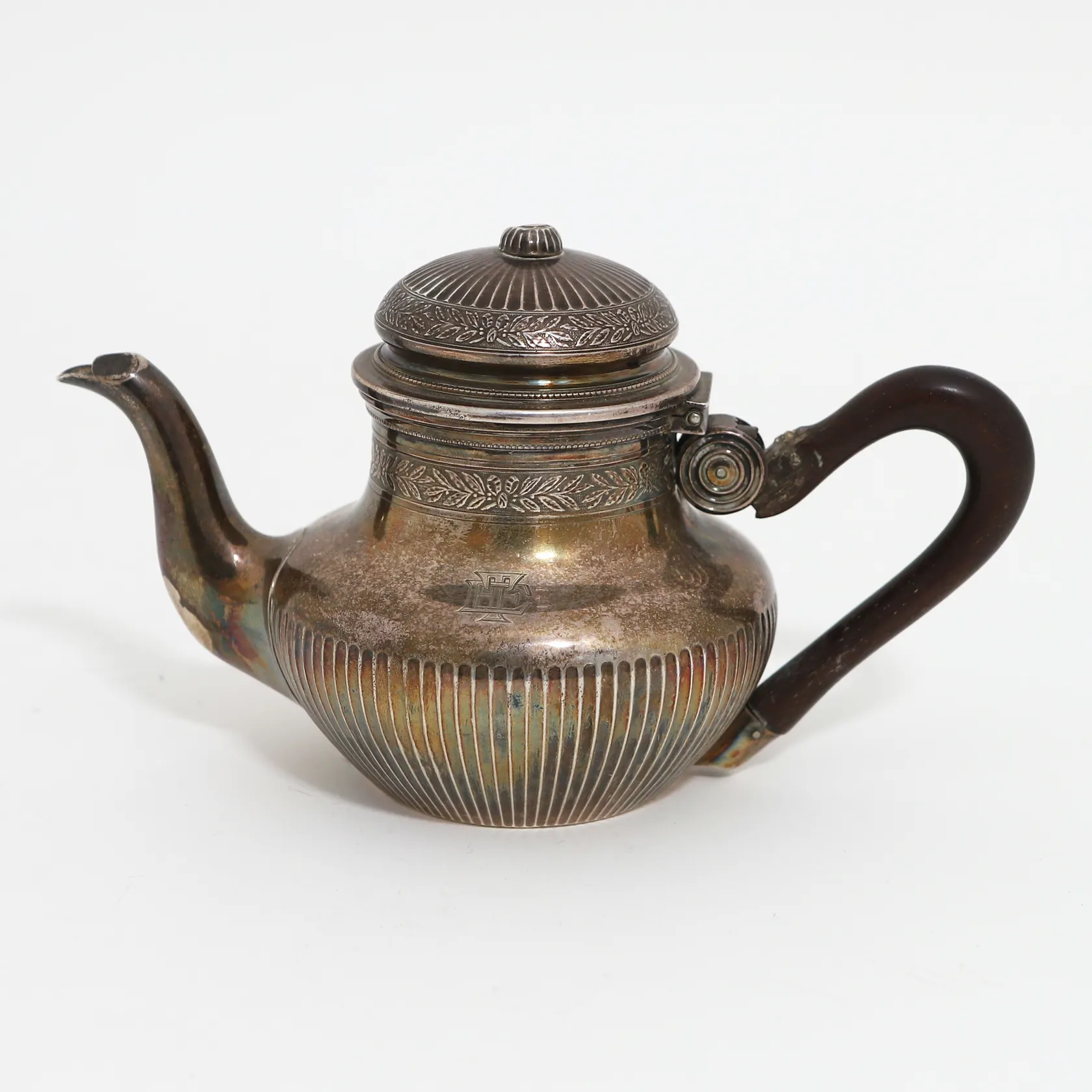 Tekanna med trähandtag, höjd: 11cm, mönstrad dekor, monogramgravyr, trasigt handtag, svenska kontrollstämplar, silver 830/1000, bruttovikt: 215,4gram Vikt: 215,4 g.