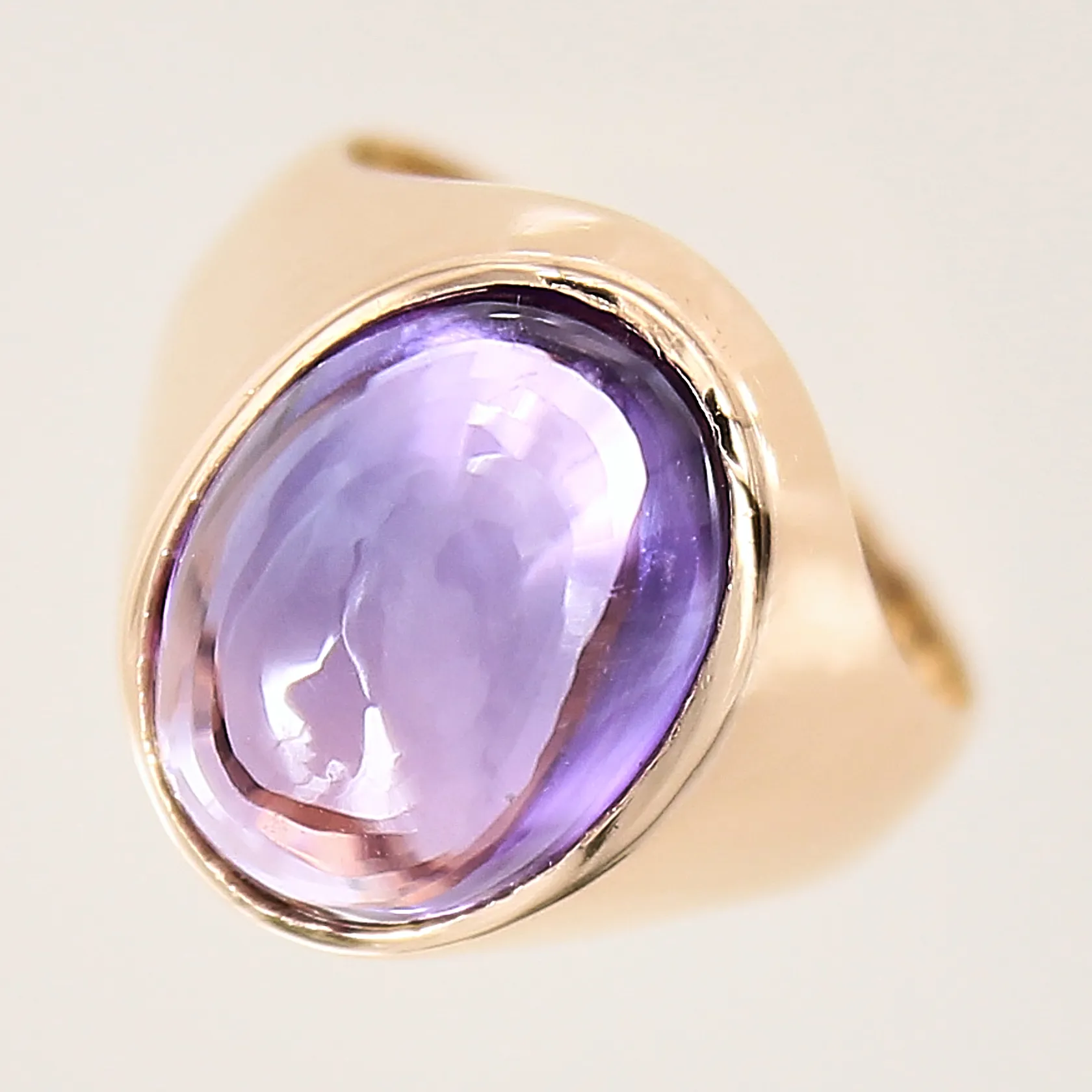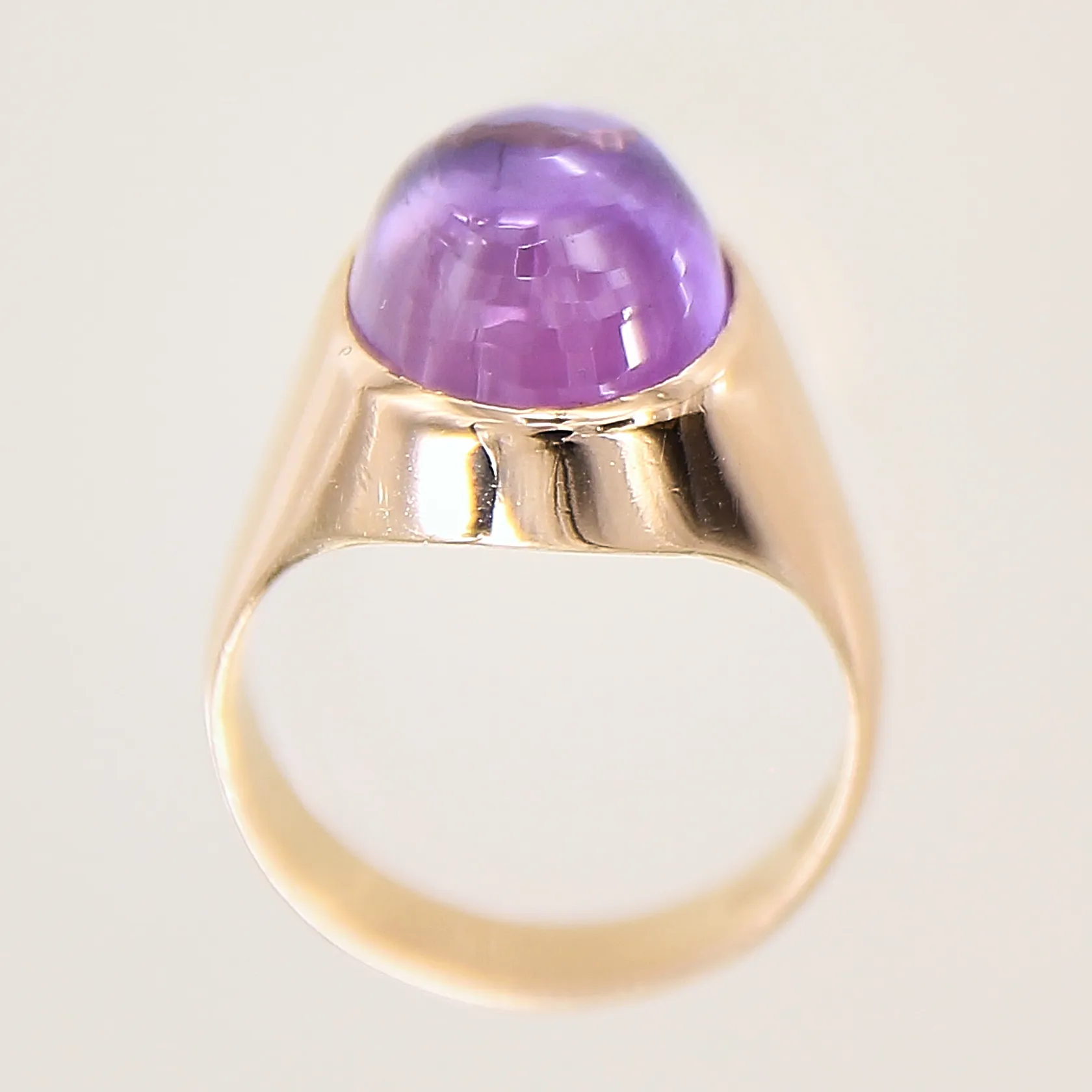 Ring med syntetisk lila safir, stl: 16¼, bredd: 3,9-15,4mm, importstämplad, 18K Vikt: 7,6 g.