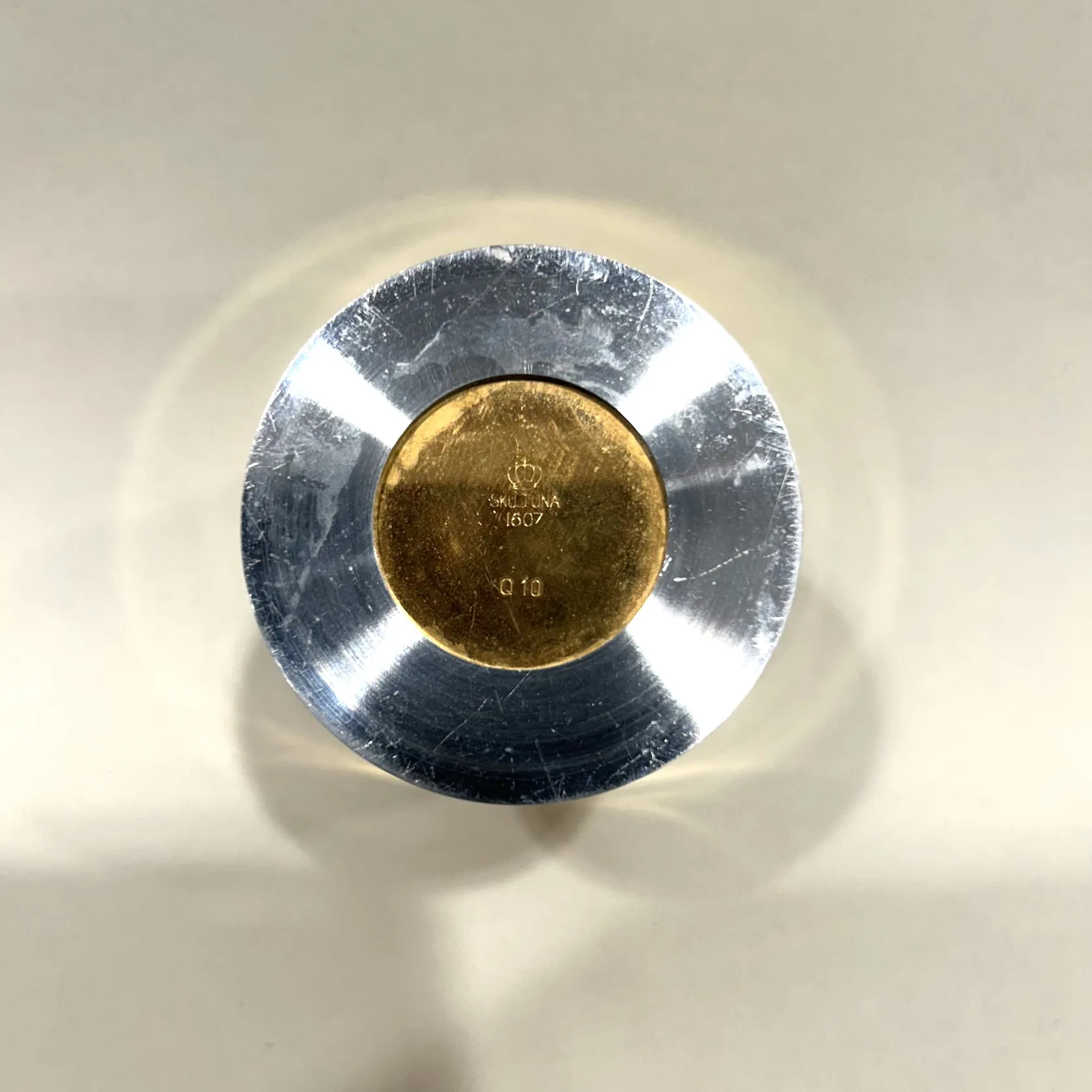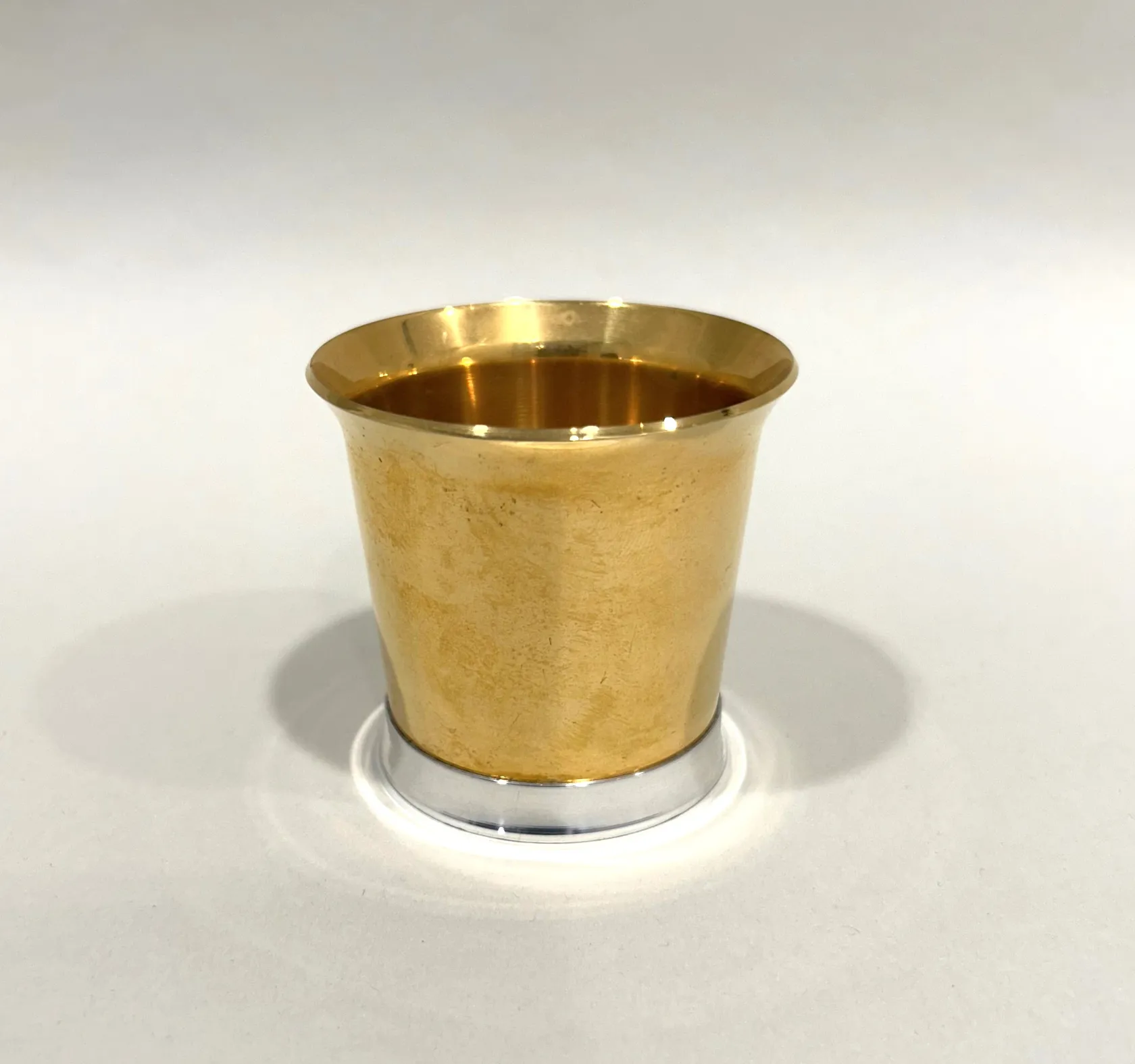 Bägare, numrerad: Q10, Skultuna, höjd 6,5cm, mässing, fotring av vit metall, tunna repor, främst undertill