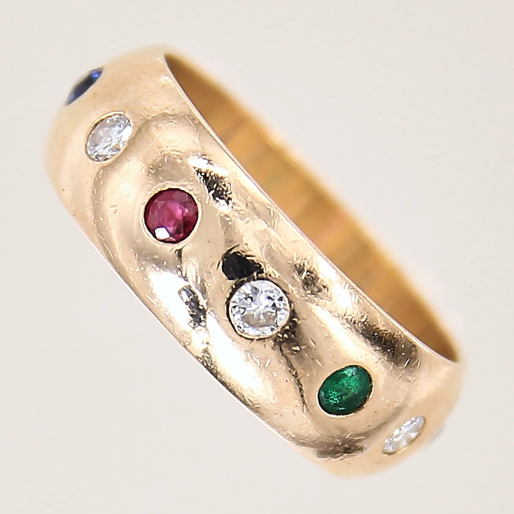 Ring med troligen syntetisk rubin, smaragd och safirer, samt diamanter 4 x ca 0,04ct, stl 18, bredd 7mm, färgstenar med slitage, 18K Vikt: 7,6 g.