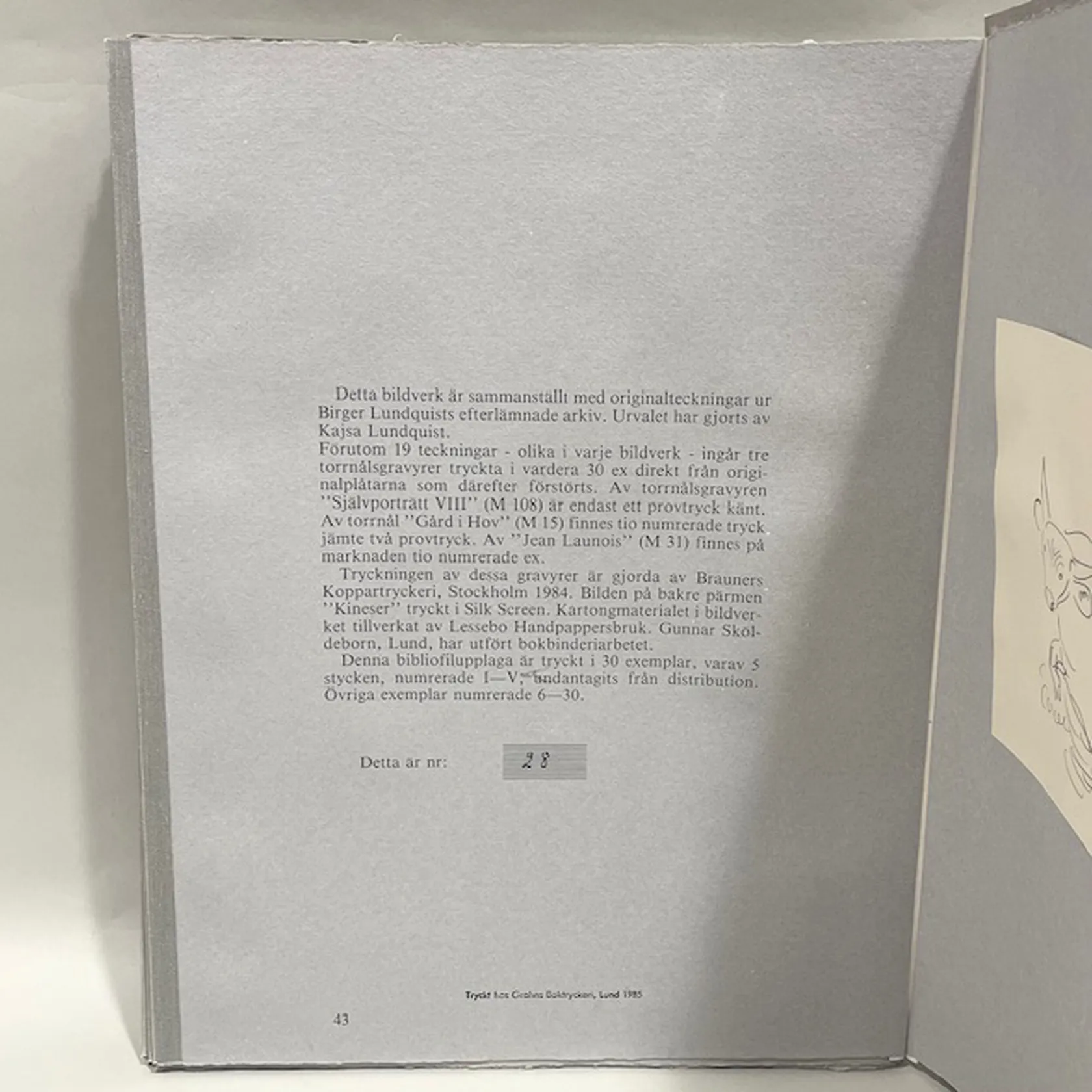 Folder, Birger Lundqvist, bildverk med 20 teckningar samt 3 torrnålsgravyrer, signerade, numrerad 28/30, 40x30x3cm