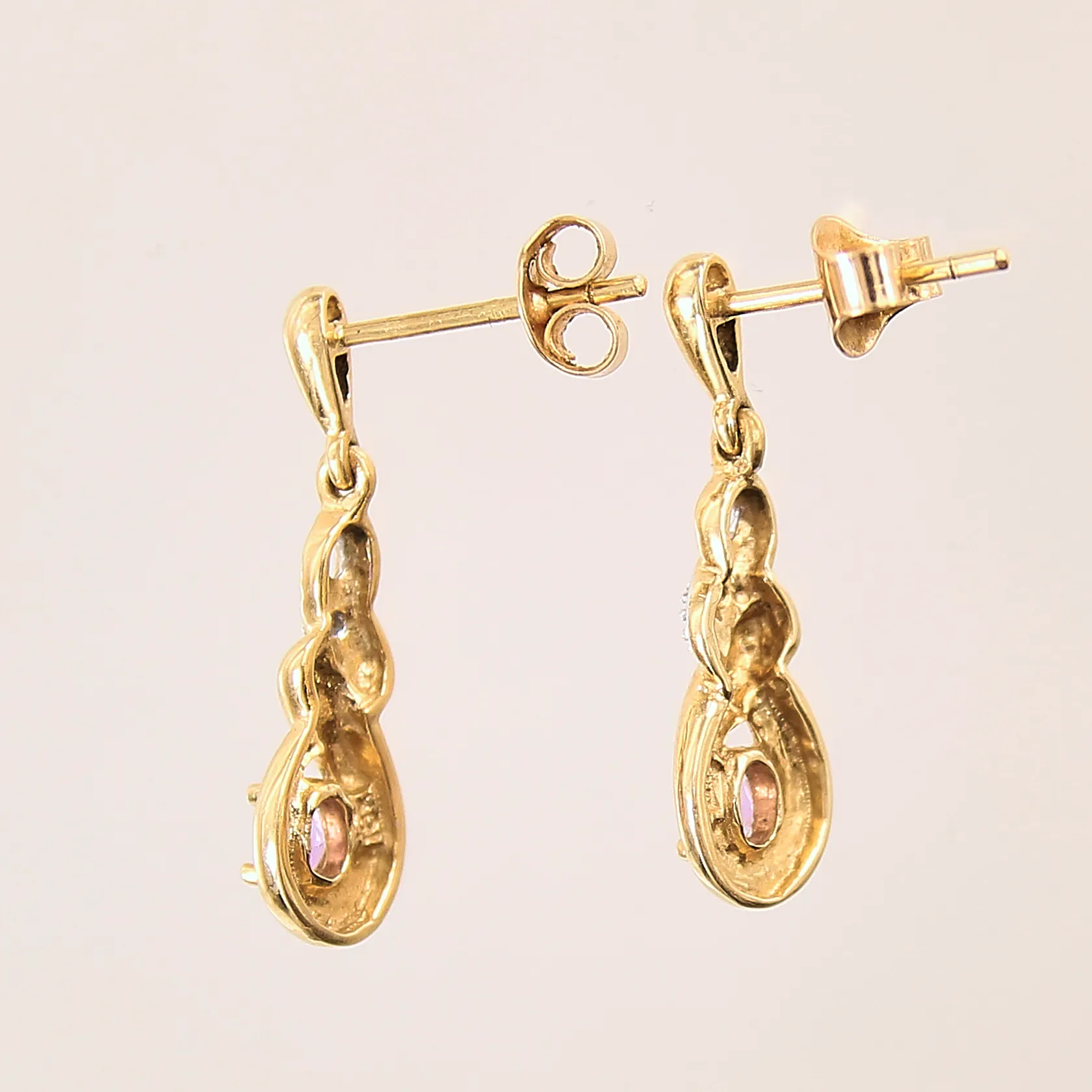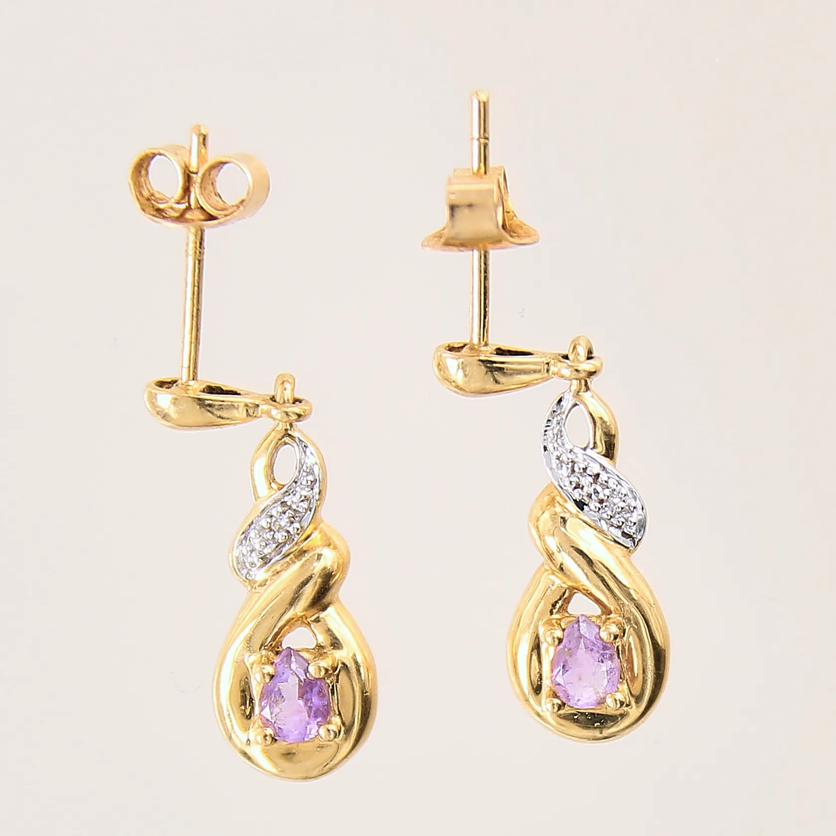 Ett par örhängen med lila stenar samt en diamant ca 0,005ct vardera, längd: 20mm, bredd: 2,6-7mm, GHA, 18K Vikt: 3,1 g.