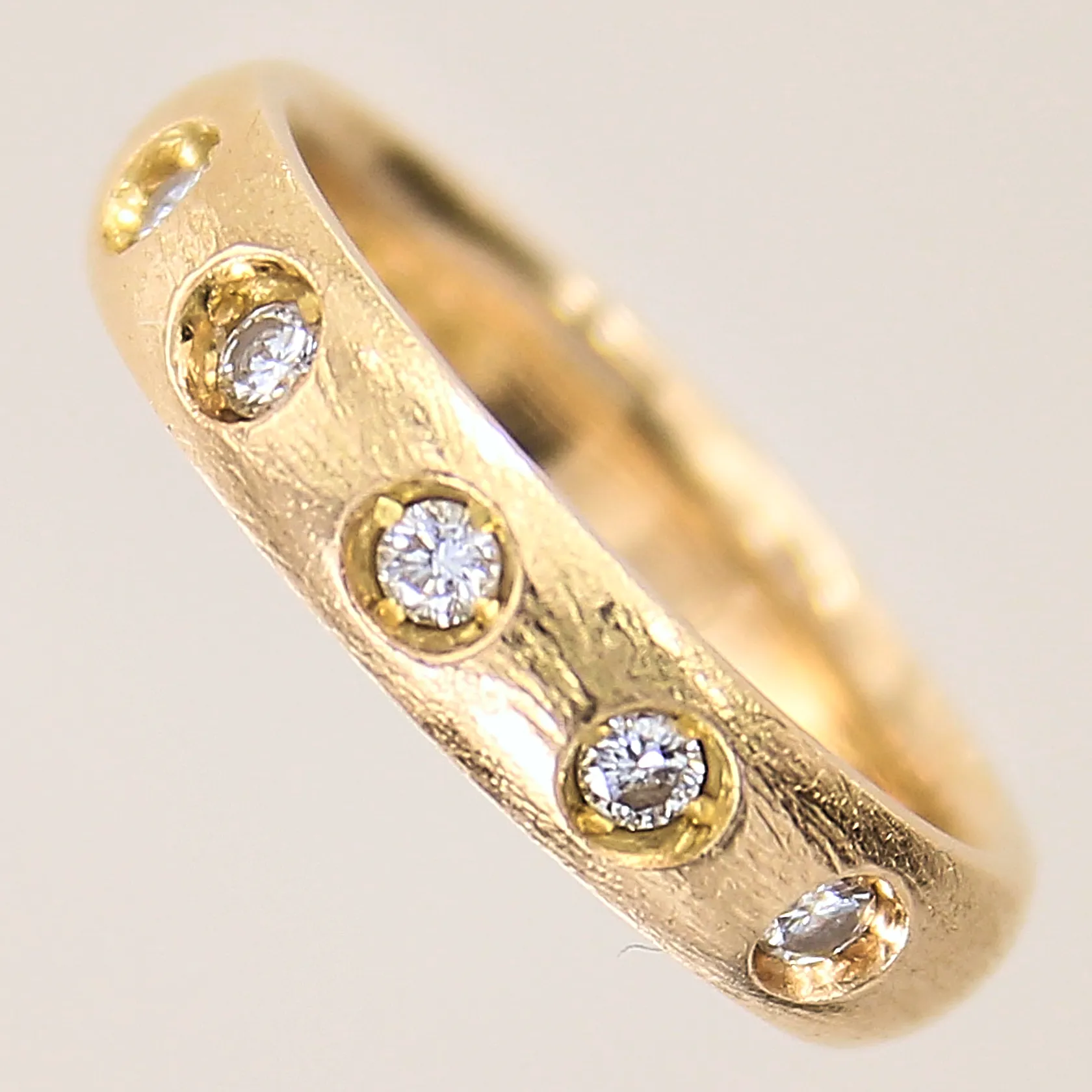 Ring med briljantslipade diamanter 5 x ca 0,04ct, borstad dekor, stl: 17, bredd: 4,4mm, 18K Finns för visning på Pantbanken Skärholmen Vikt: 5,8 g.