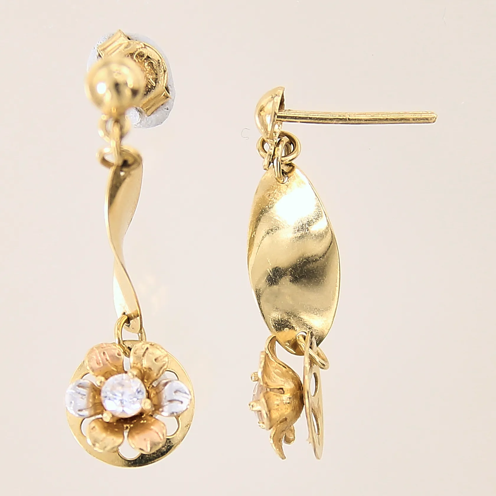 Ett par örhängen med vita stenar, längd 31,8mm, bredd 4-9mm, trefärgad, en snurrebuss i plast, 18K Vikt: 2,6 g.