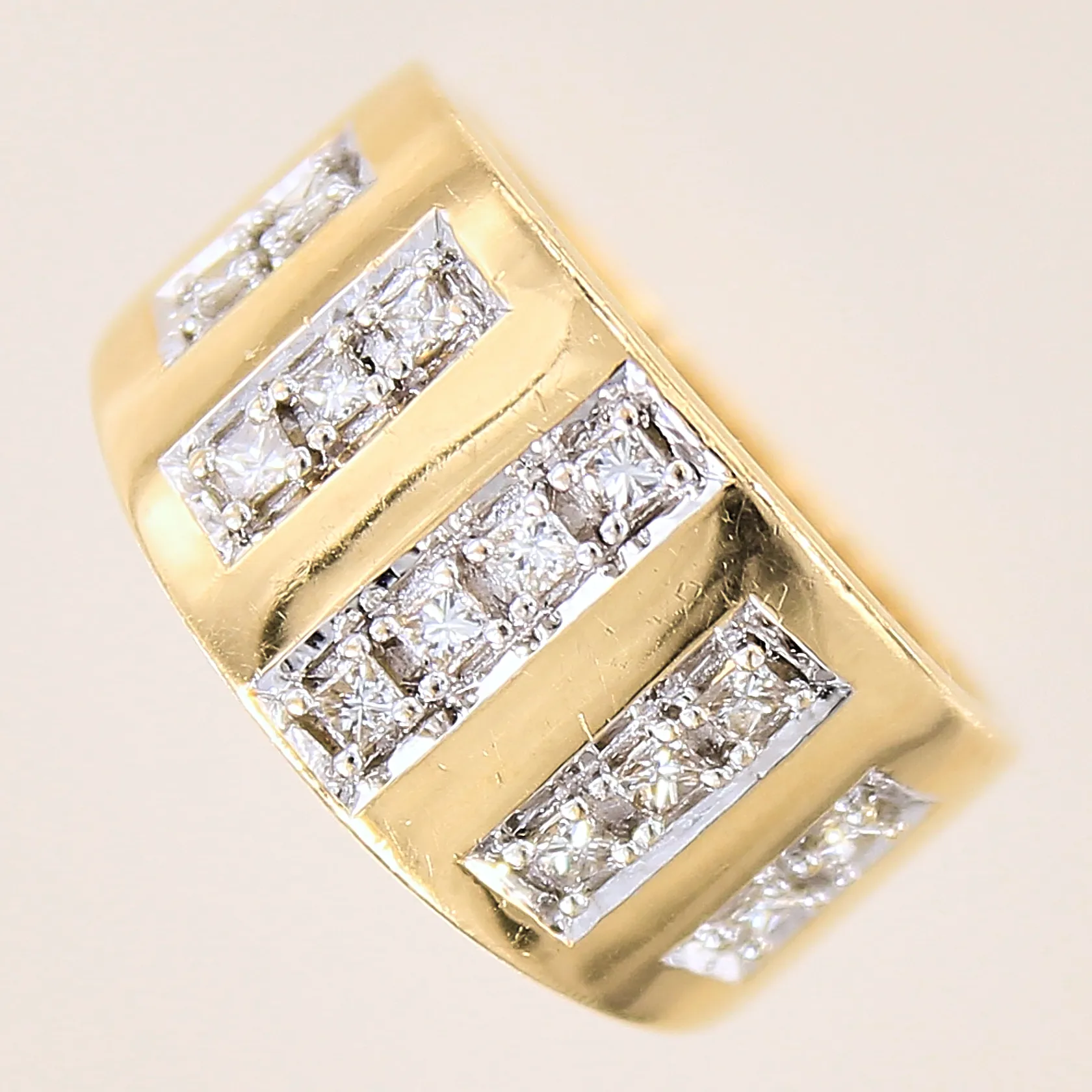 Ring med princesslipade diamanter 14 x ca 0,02ct, stl: 18¼, bredd: 5,8-12mm, 18K Vikt: 8,3 g.