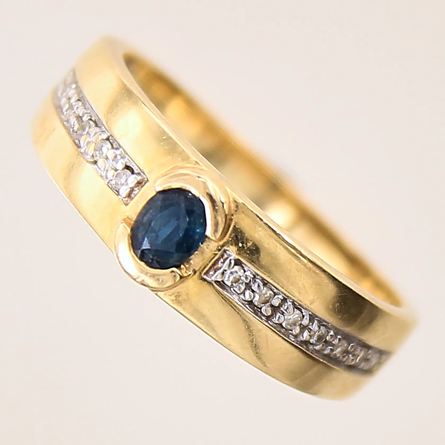 Ring med safir samt 8/8-slipade diamanter 14 x ca 0,005ct, stl 17, bredd 2,6-6mm, GHA, 18K Vikt: 3,3 g.