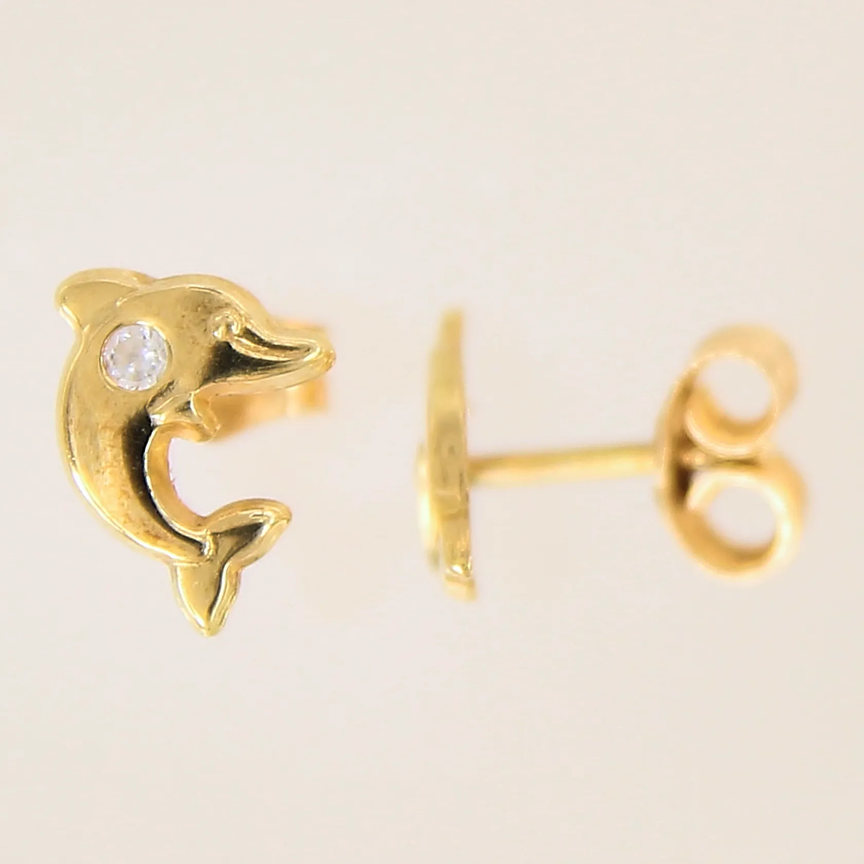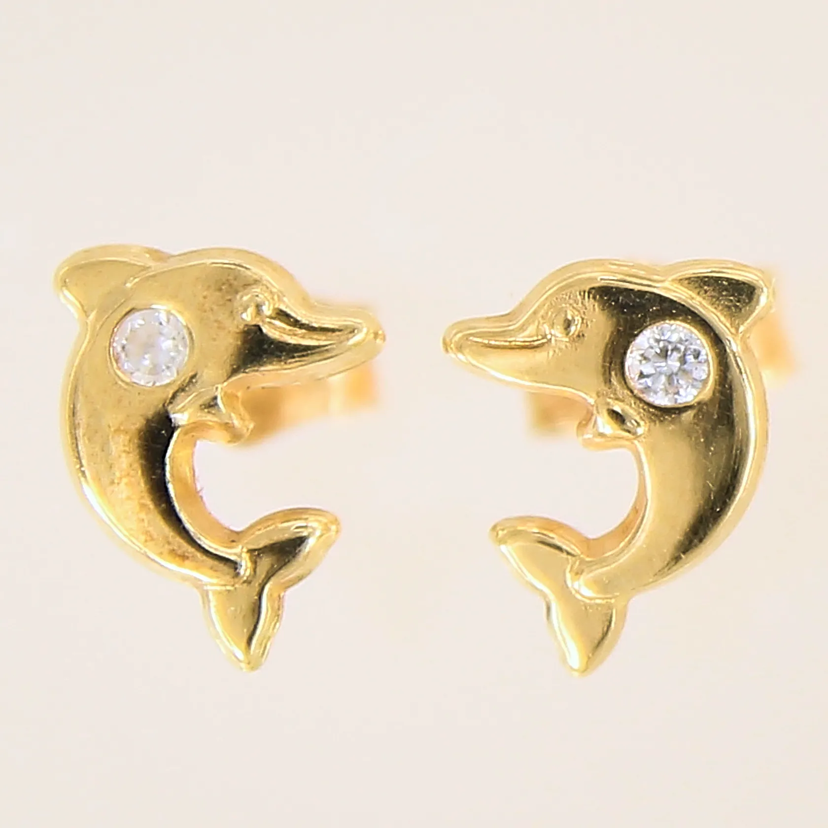 Ett par örhängen med vita stenar, delfiner, Ø8mm, något skeva stift, 18K Vikt: 0,8 g.