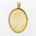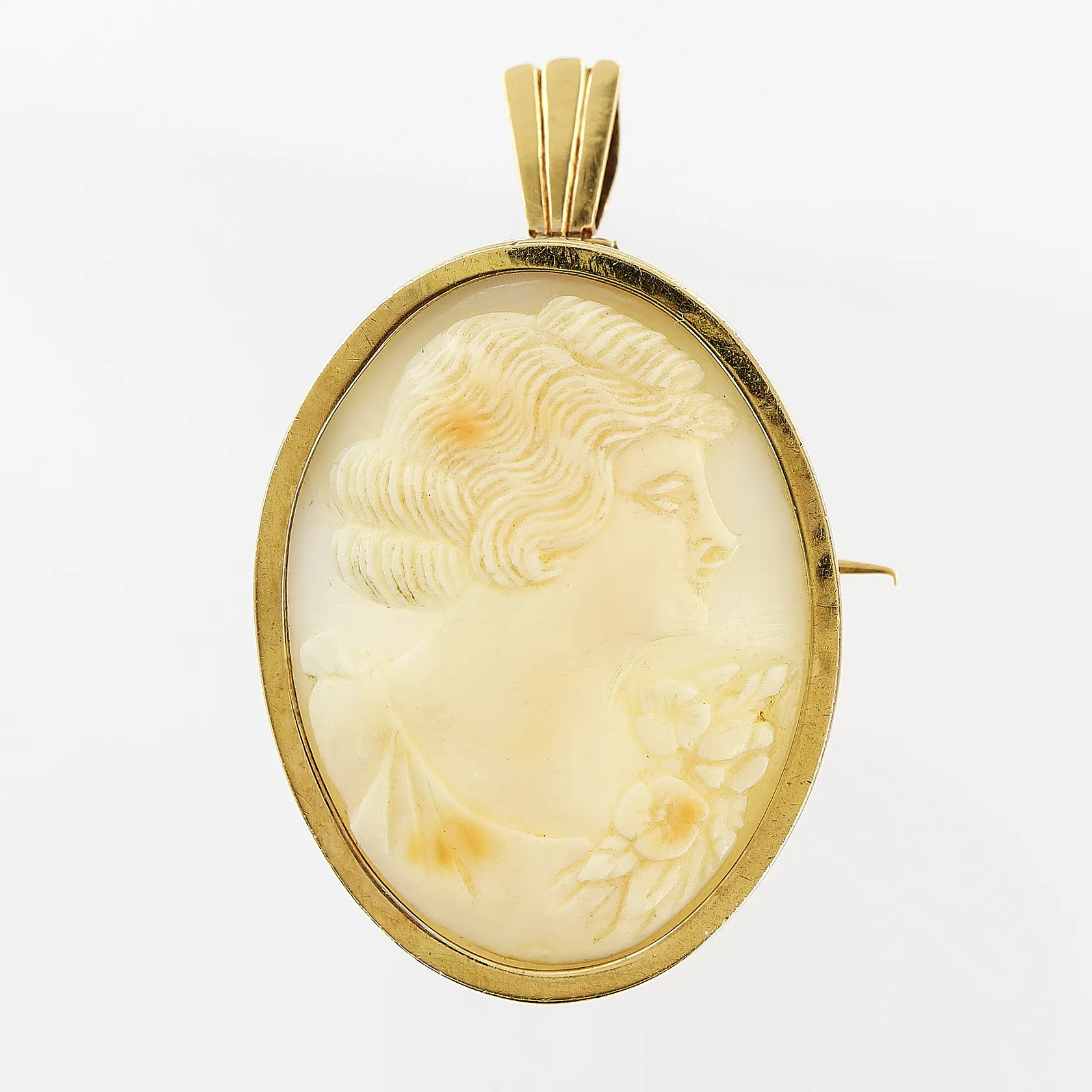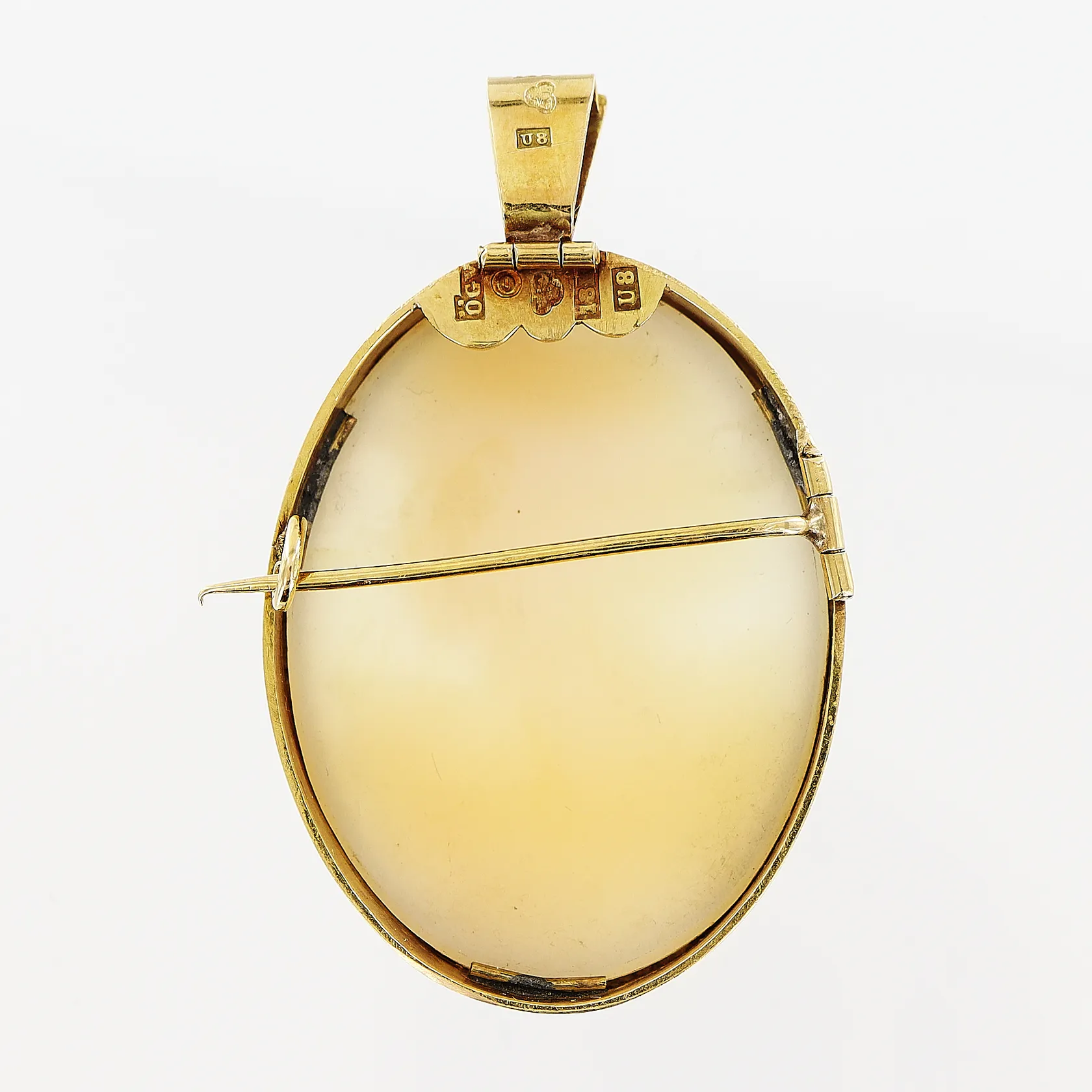 Hänge/Brosch, Camé, 50x32mm, skev och synlig nål, 18K. Bruttovikt: 18,1gram. Vikt: 18,1 g.