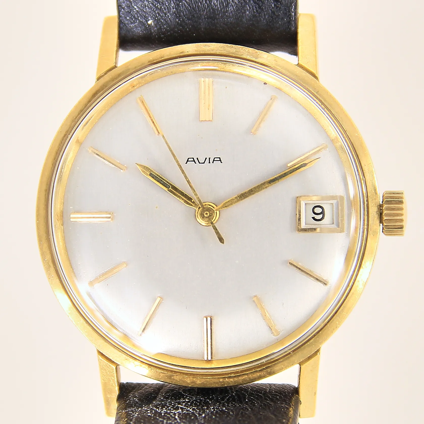 Herrur Avia, 18K, automatisk, boett-nr: 15900, Ø34mm, läderband ej original med slitage, datum, plexiglas, repig boett, inga tillbehör