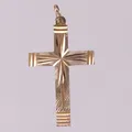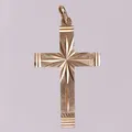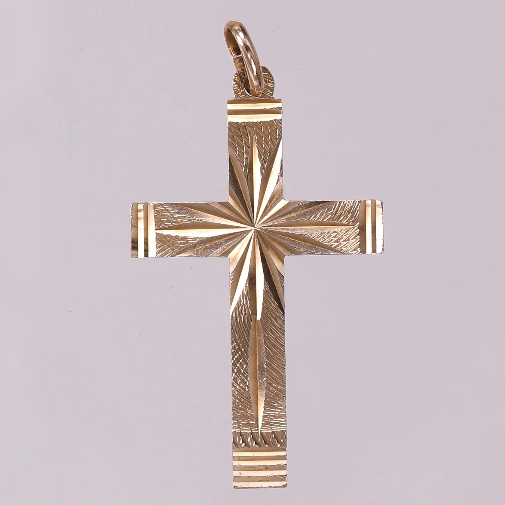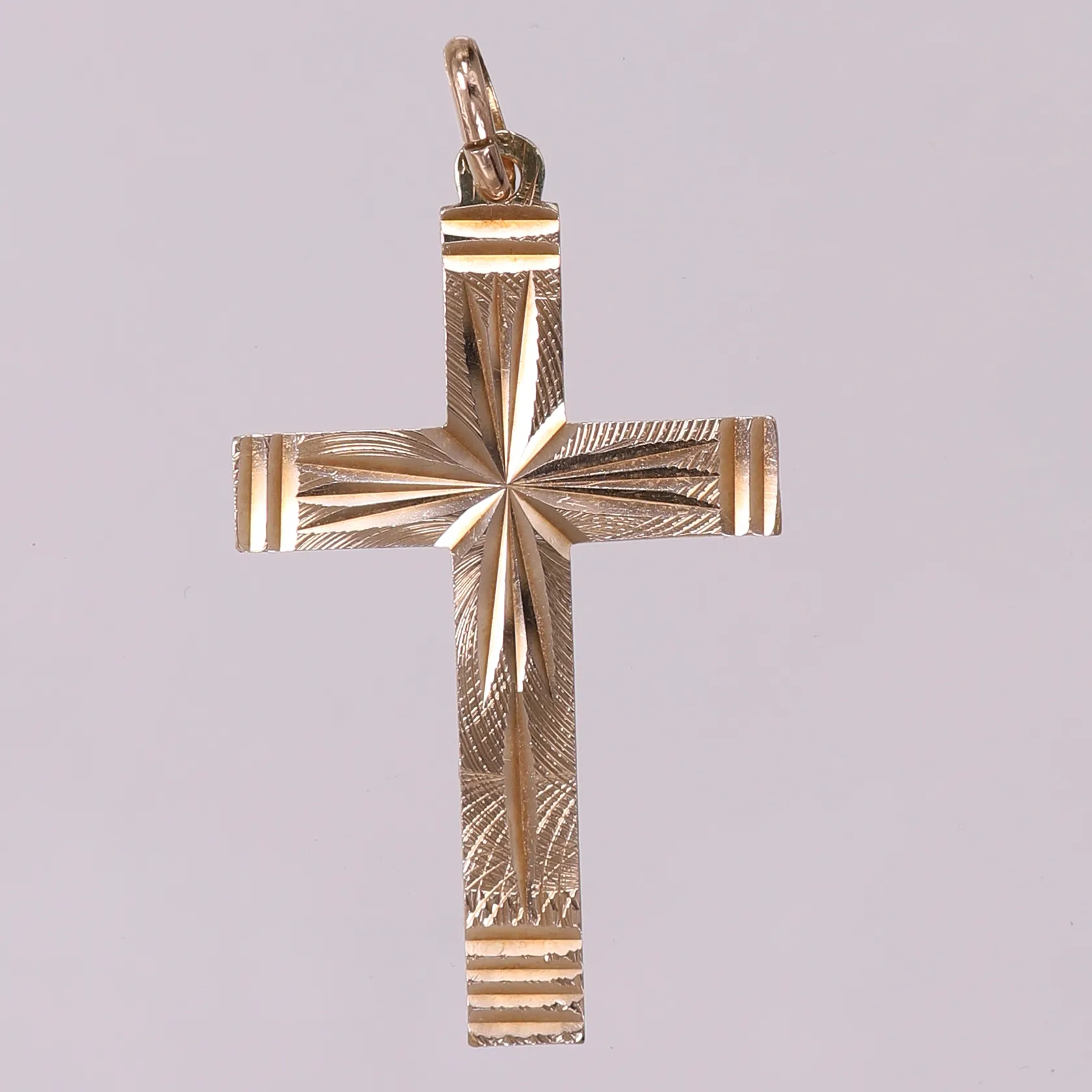 Hänge kors med dekor, ca 42mm inkl. ögla, bredd 23,5mm. 14K Vikt: 2,9 g.