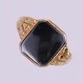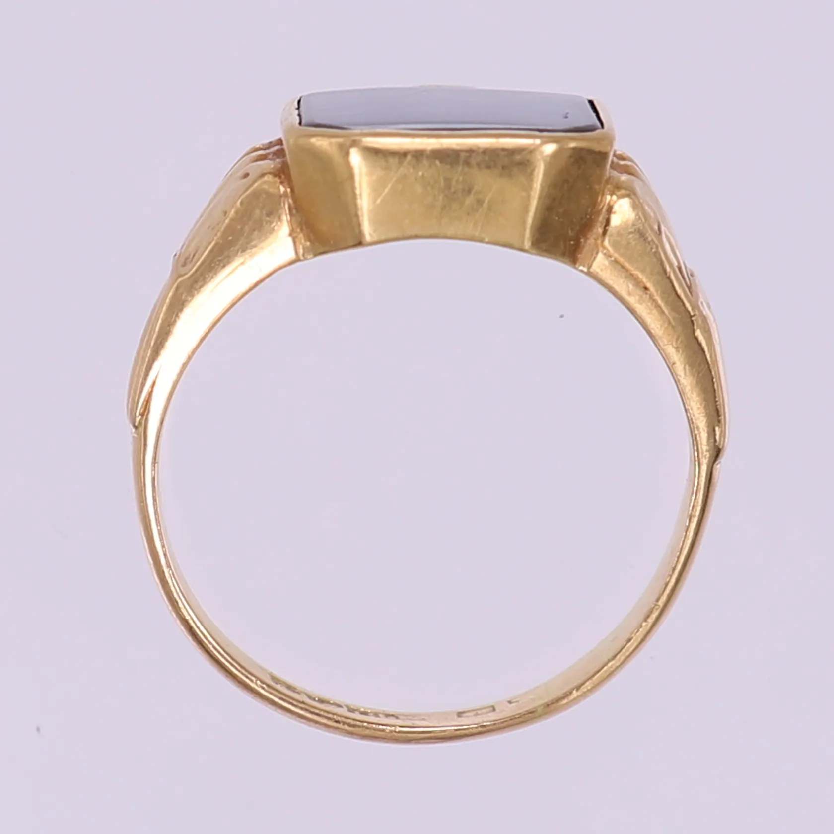 Klackring med onyx, stl 20¼, ca bredd 3mm, fattningens mått 15x12mm. 18K Vikt: 7,5 g.