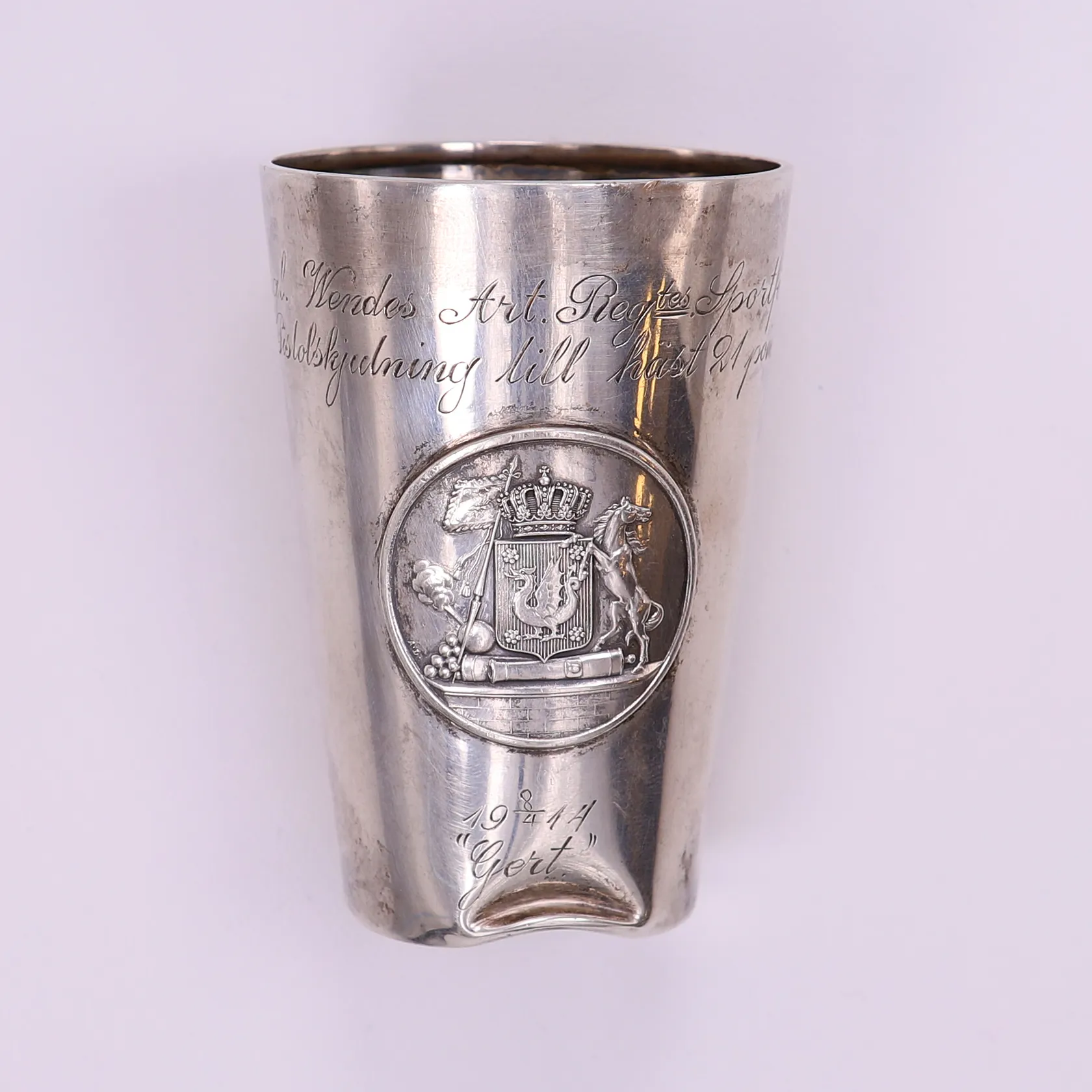 Pokal med emblem, höjd 7,5cm, gravyr, buckla, silver 830/1000. Vikt: 47,8 g.